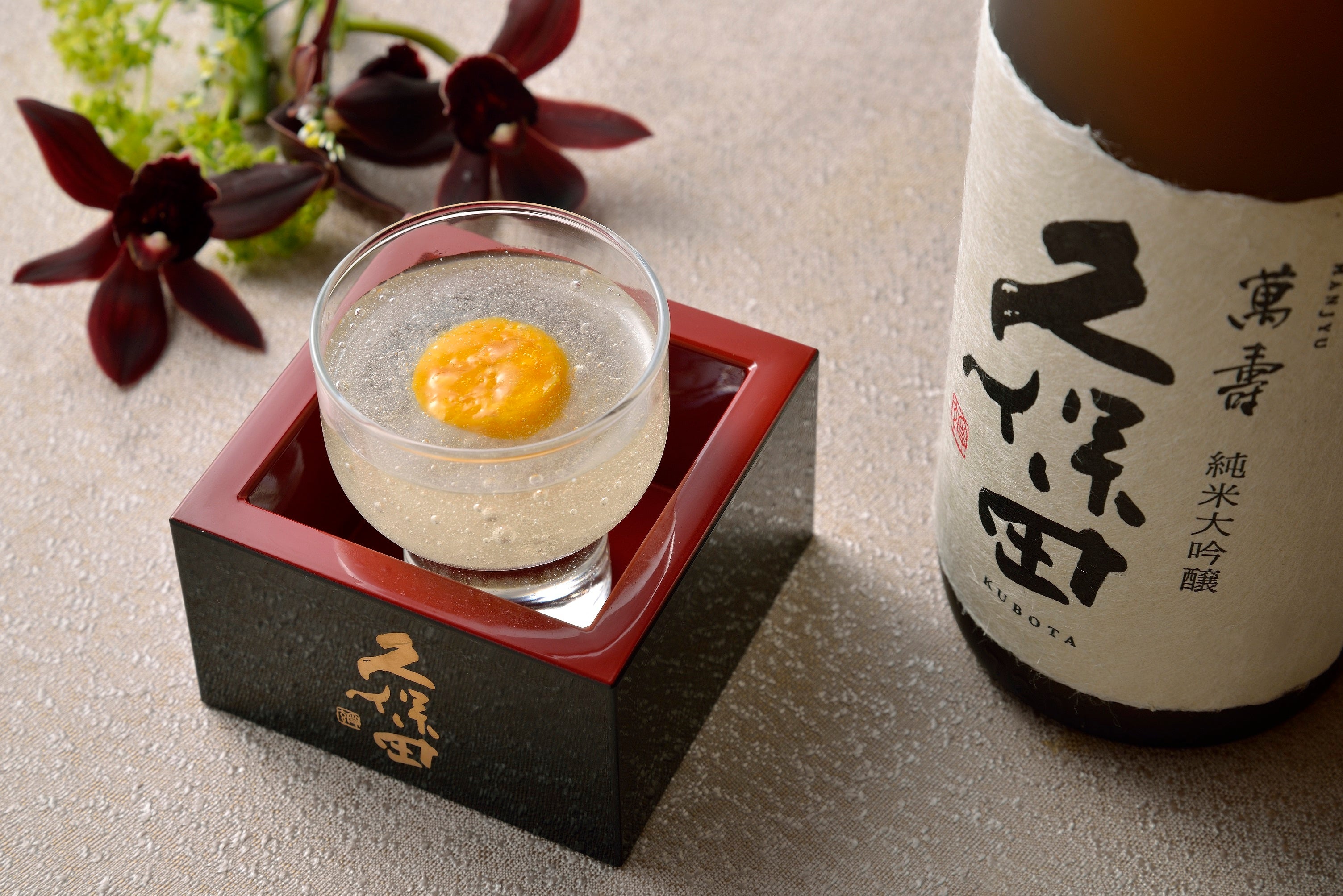 別皿では、水面に移る月をイメージしたグラススイーツをご提供いたします。華やかな香りで、重厚な味わいの純米大吟醸酒「久保田 萬寿」のジュレの中に、月に見立てたマンゴーピューレを入れた「萬寿 マンゴーの月見酒」は、ほどよい甘味と萬寿のすっきりとした味わいが楽しめます。