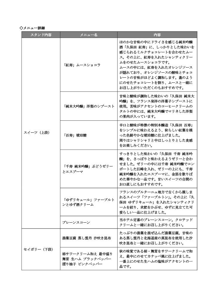 上段のスイーツは、苦味がアクセントのコーヒークリームのタルトの中に、甘味と酸味が調和した味わいの「久保田 純米大吟醸」でマリネした洋梨の果肉が入った洋梨のシブーストや、すっきりとした味わいの「久保田 千寿 純米吟醸」が入ったゼリーの中に、千寿 純米吟醸でコンポートした巨峰を入れたぶどうゼリーとエスプーマなど6種をご提供いたします。