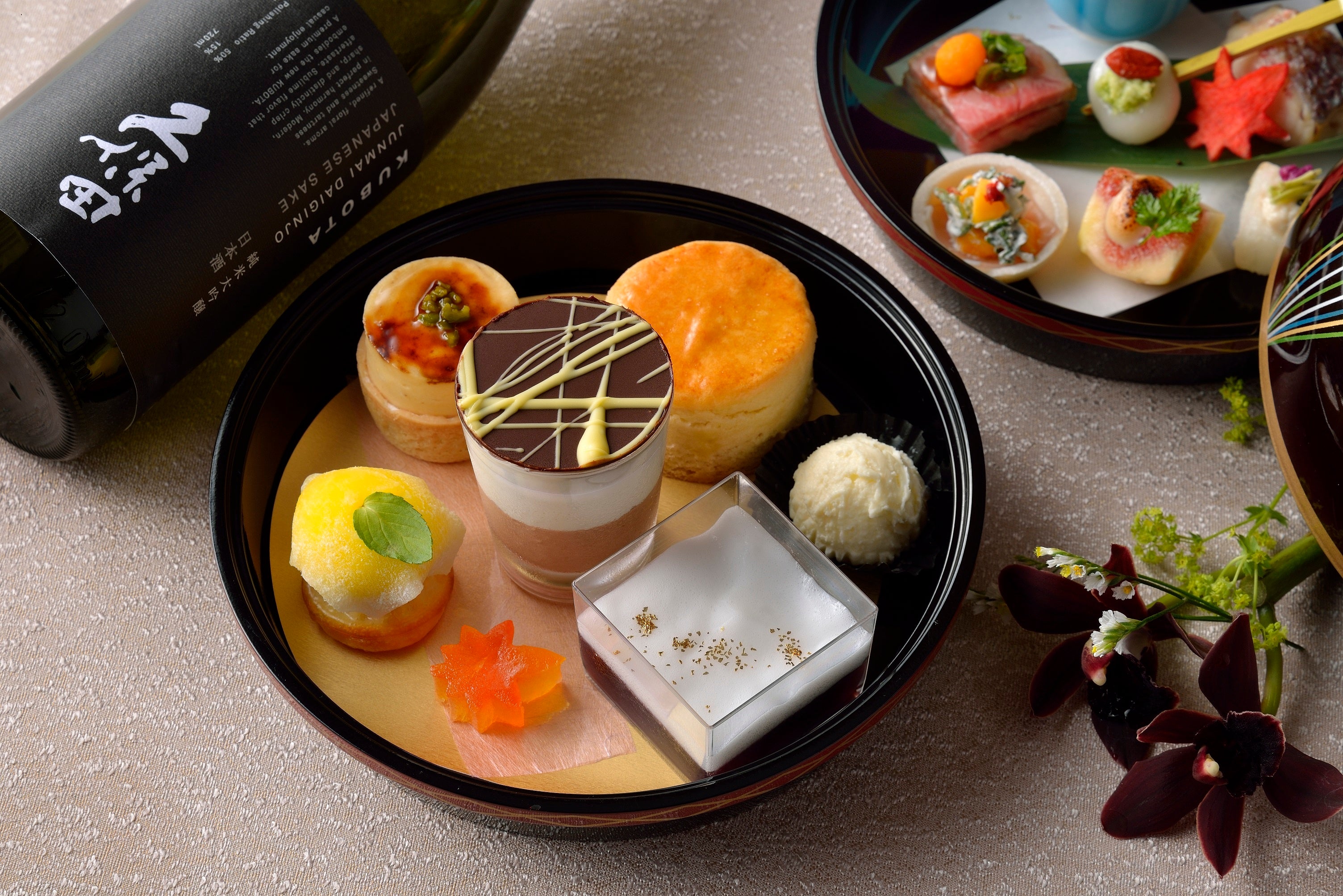 下段のセイボリーは、揚げた海老芋に山葵と久保田の酒粕を使用した酒粕クリームをのせた海老芋酒粕和えや、旬の柿や舞茸を使用したメニューなど、8種をご提供いたします。