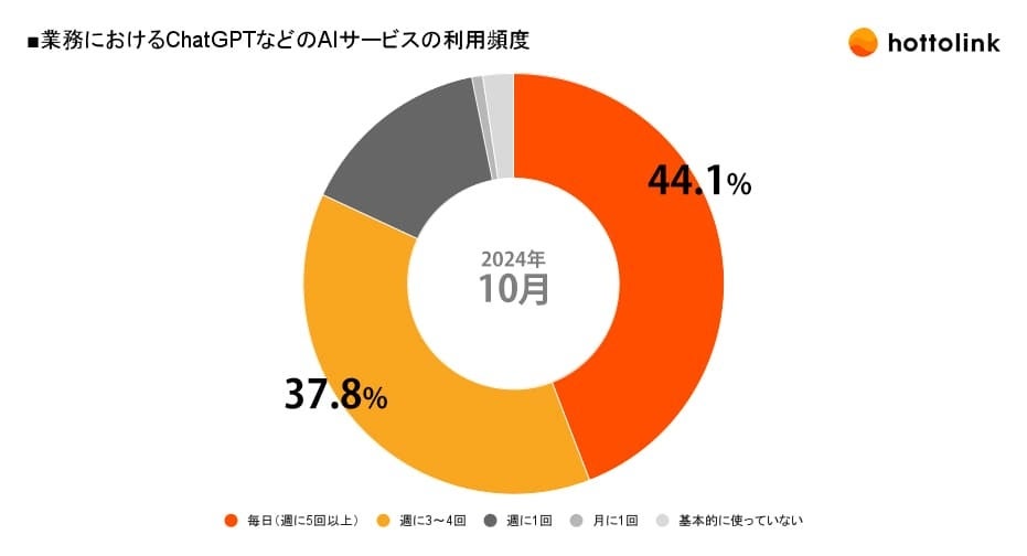 「毎日(週に5回以上)」の割合は44.1%で、7月調査時より8.3%上昇しました。また、「週に3~4回」の割合は37.8%で、7月調査時より2.0%上昇しました。2024年7月と本格導入前の2024年4月のデータは、プレスリリース「ホットリンク、ChatGPTなどのAIツールによる業務効率化を推進」をご覧ください。