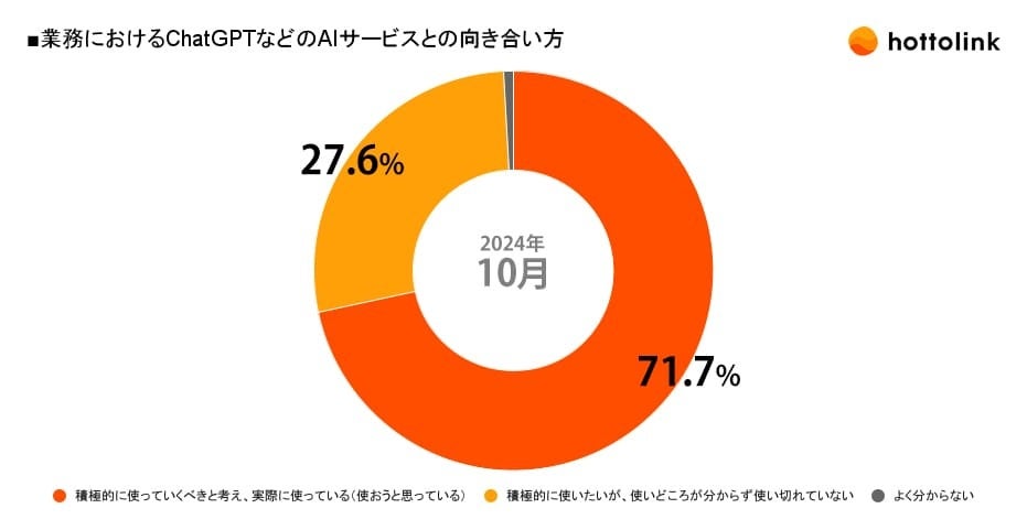 SNSマーケティング支援サービスを提供する株式会社ホットリンク(本社:東京都千代田区、証券コード:3680、代表取締役:内山幸樹、以下ホットリンク)は、生成AIツールの活用状況について、2024年10月度の社内調査を実施しました。本プレスリリースでは、全社的なAI活用の現状や今後の展望をご報告いたします。