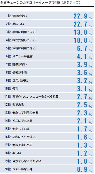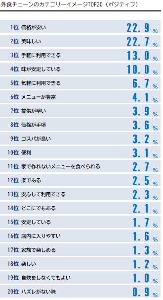 外食チェーンのポジティブイメージは「価格が安い」がTOPです。
