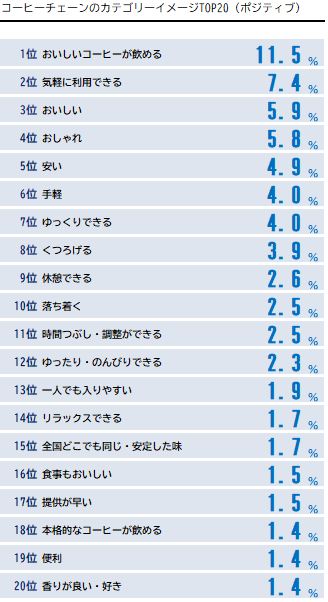 コーヒーチェーンのポジティブイメージは「おいしいコーヒーが飲める」がTOPです。