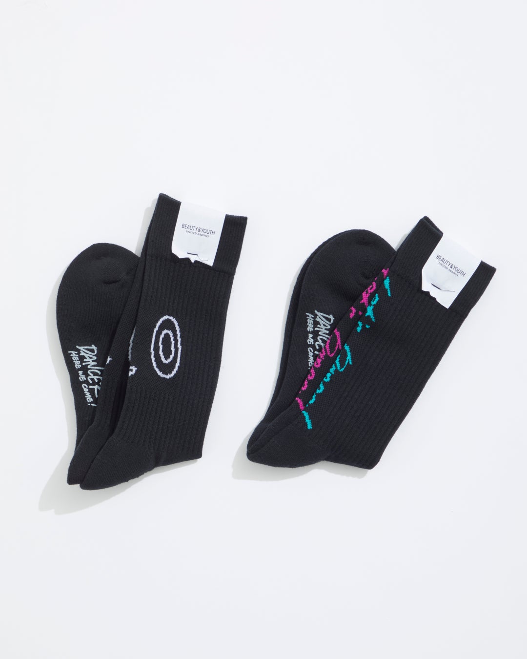 「DANCE-K」と「Let's Dance!」のメッセージをジャカードで表現したデザインソックス。足底部分はパイル仕様でスニーカーとの相性も抜群です。パンツのロールアップスタイルにもショーツスタイルにも似合う、コーディネートのアクセントになるソックスです。