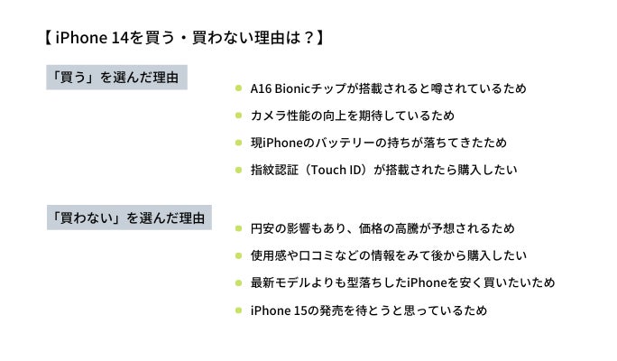 - 調査結果①iPhone 14は67.4%の人が「買わない」と回答
