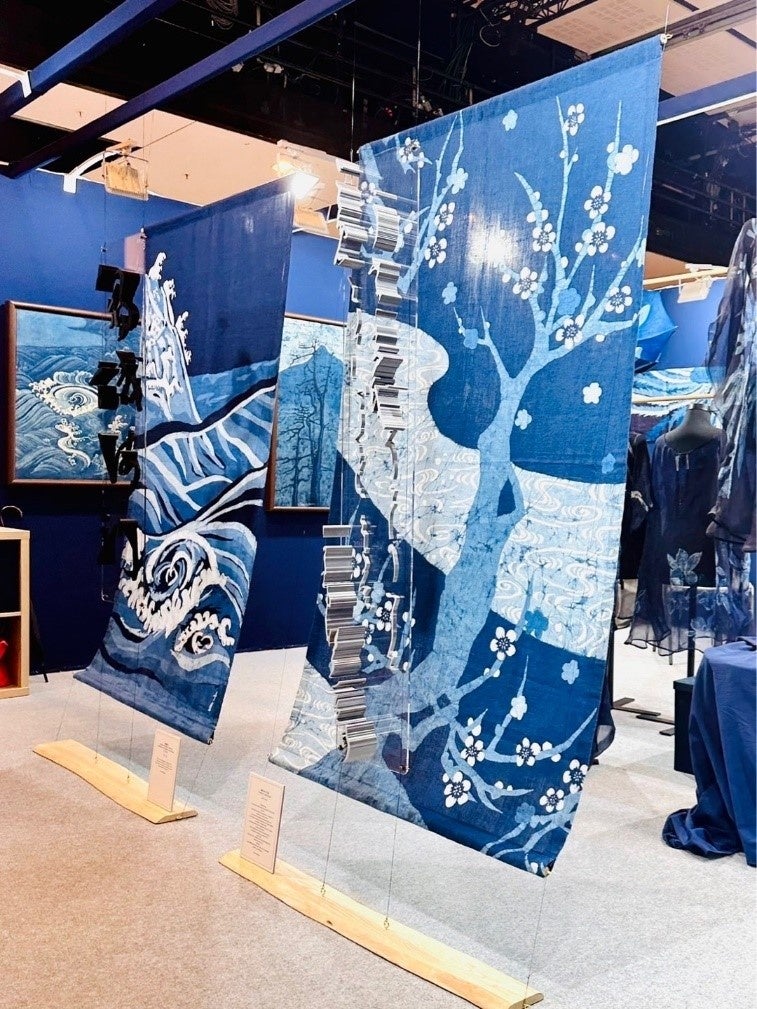 藍のろうけつ染め作品と書の融合により、独特な世界を表現した掛け軸、タペストリーを展示