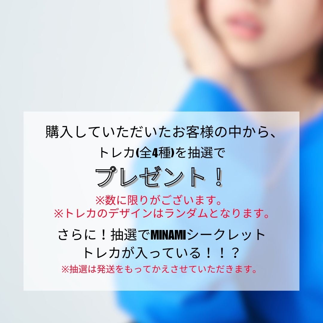 【mnmオーバーサイズロンT】を1点ご購入につき抽選で、MINAMIのトレーディングカード(全4種類)の中からランダムで1枚をプレゼント致します。また、限定でシークレットカードが入っておりますので是非お楽しみにしてください。