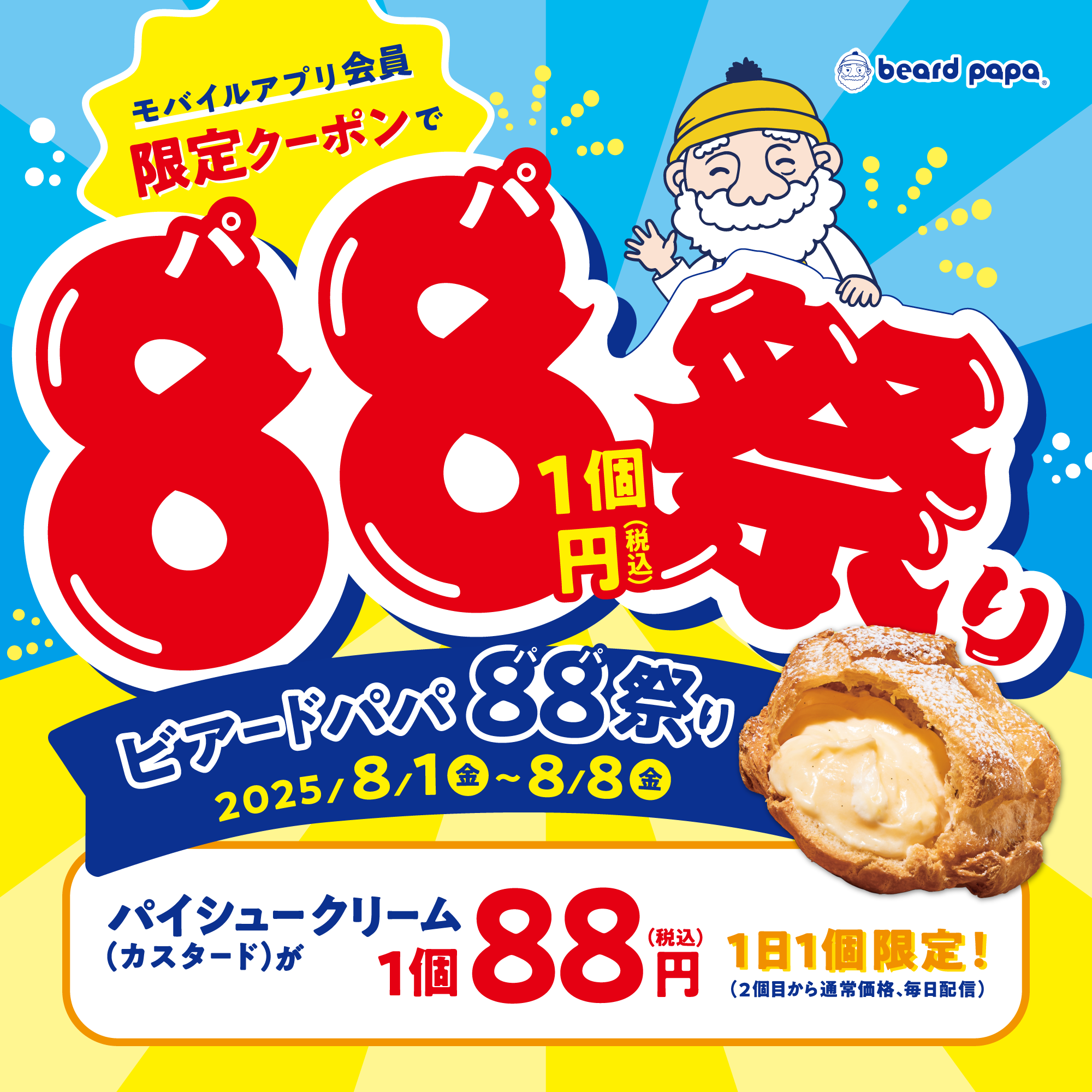 【8/1~8/8まで】毎日おトクな「ビアードパパ88祭り」を開催!モバイルアプリ会員さま限定で“パイシュークリーム(カスタード)”が1個88円!