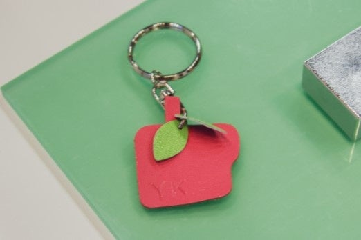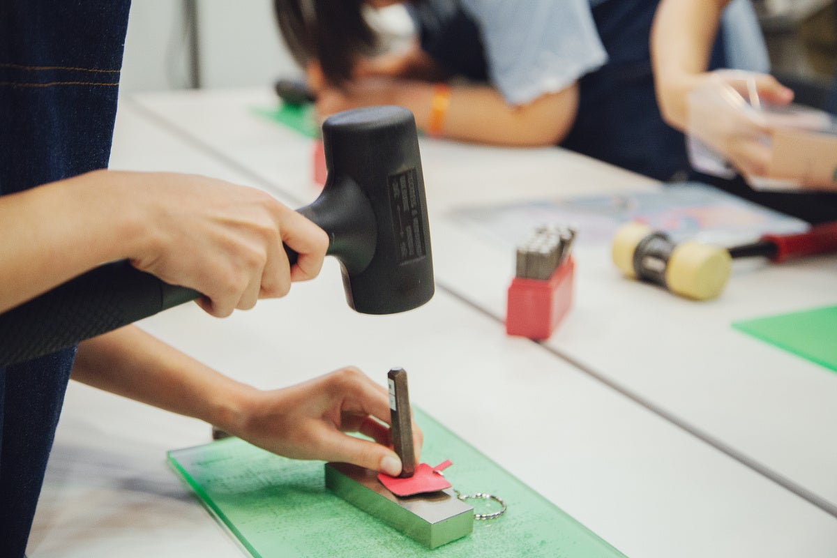 最後は、ランドセル職人とおそろいのデニムエプロンを着て、職人体験に挑戦してもらいました。前述のクイズにも登場したランドセルパーツのひとつである「ツマミ」。ツマミをりんごの形に見立てたキーホルダーに、自分で選んだアルファベット2文字を刻印しました。使用したトンカチは、職人が実際の製造作業で使っているもの。小さいアルファベットの刻印棒はしっかり押さえていないとぐらぐらしてしまうため、まっすぐ打ち付けるのに苦戦する子も。次第にコツを掴み、集中していく姿が印象的でしたが、完成するとパッと笑顔になり、「見てみて!」「楽しかった!」とたくさんの声を聞かせてくれました。