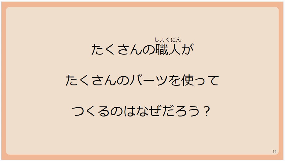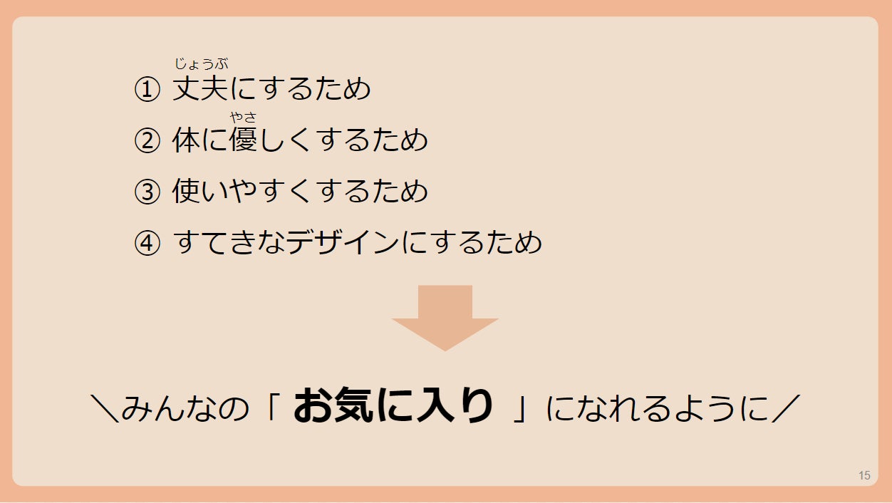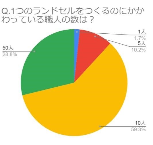 4つのクイズのうち、「28.8%」と正答率が最も低かった問題は「1つのランドセルをつくるのに関わっている職人の数は?」でした。正解は「50人」。土屋鞄のランドセルは1人の職人がつくり上げるのではなく、パーツごとの班に分かれて、リレーのようにつなぐ分業制でつくられています。1番多かった回答は「10人」の59.3%。「こんなに多いと思わなかった」と驚く子も。「たくさんの職人がたくさんのパーツを使ってつくるのは、お気に入りのランドセルとして使ってもらえるよう、丈夫かつ安全に、使いやすく素敵なデザインにするため」と伝えました。