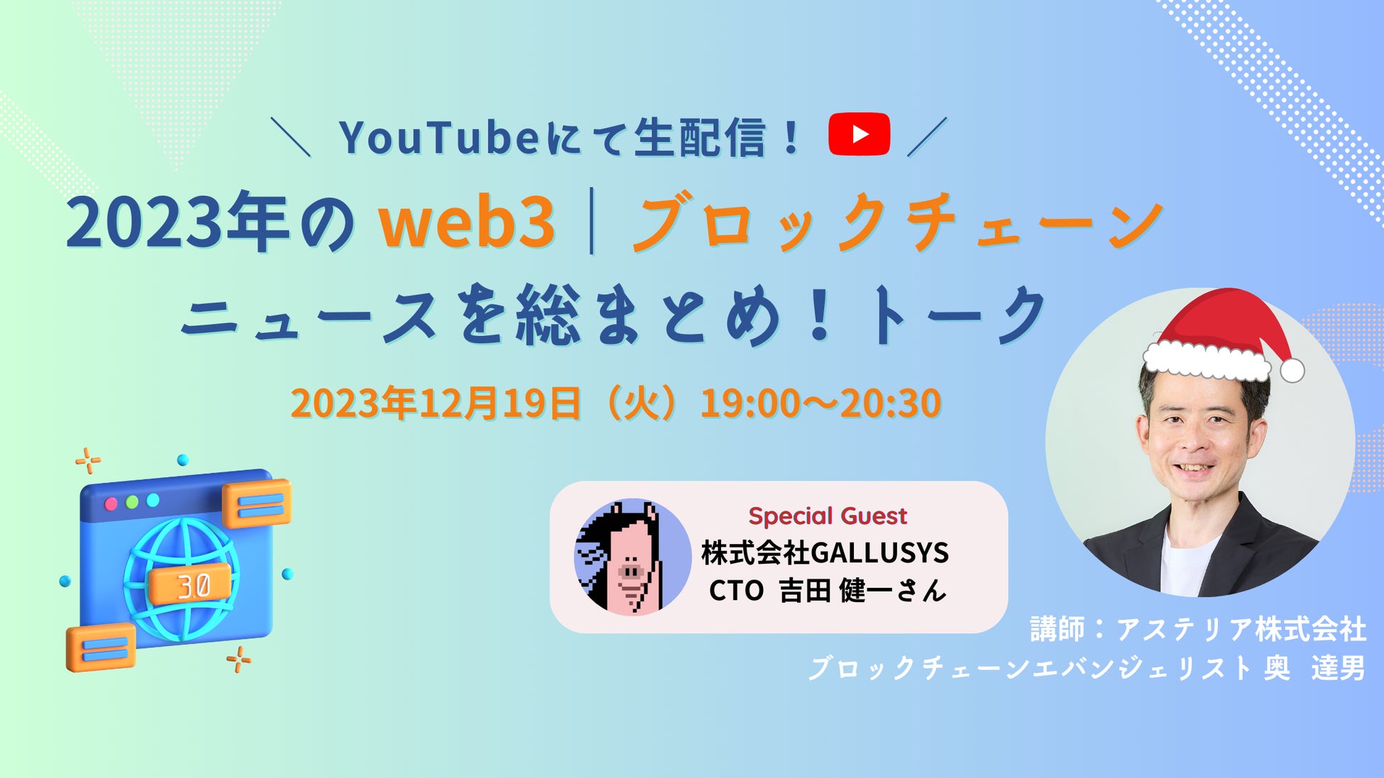 そこで、アステリアはこの1年間のweb3・ブロックチェーン業界ニュースについて振り返るイベントを12月19日に開催することを決定。国内外のニュースをもとに、業界の最新トレンドと2024年の技術展望を、当社ブロックチェーンエバンジェリストの奥達男が生配信で解説します。