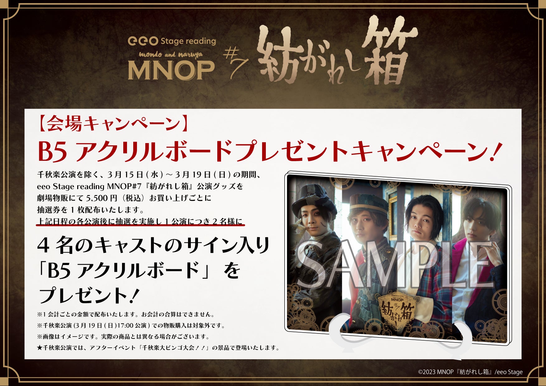 2023年3月公演のeeo Stage reading MNOP#7『紡がれし箱』のグッズ情報が公開! グッズ購入者のなかから抽選で豪華なプレゼントのお渡しも