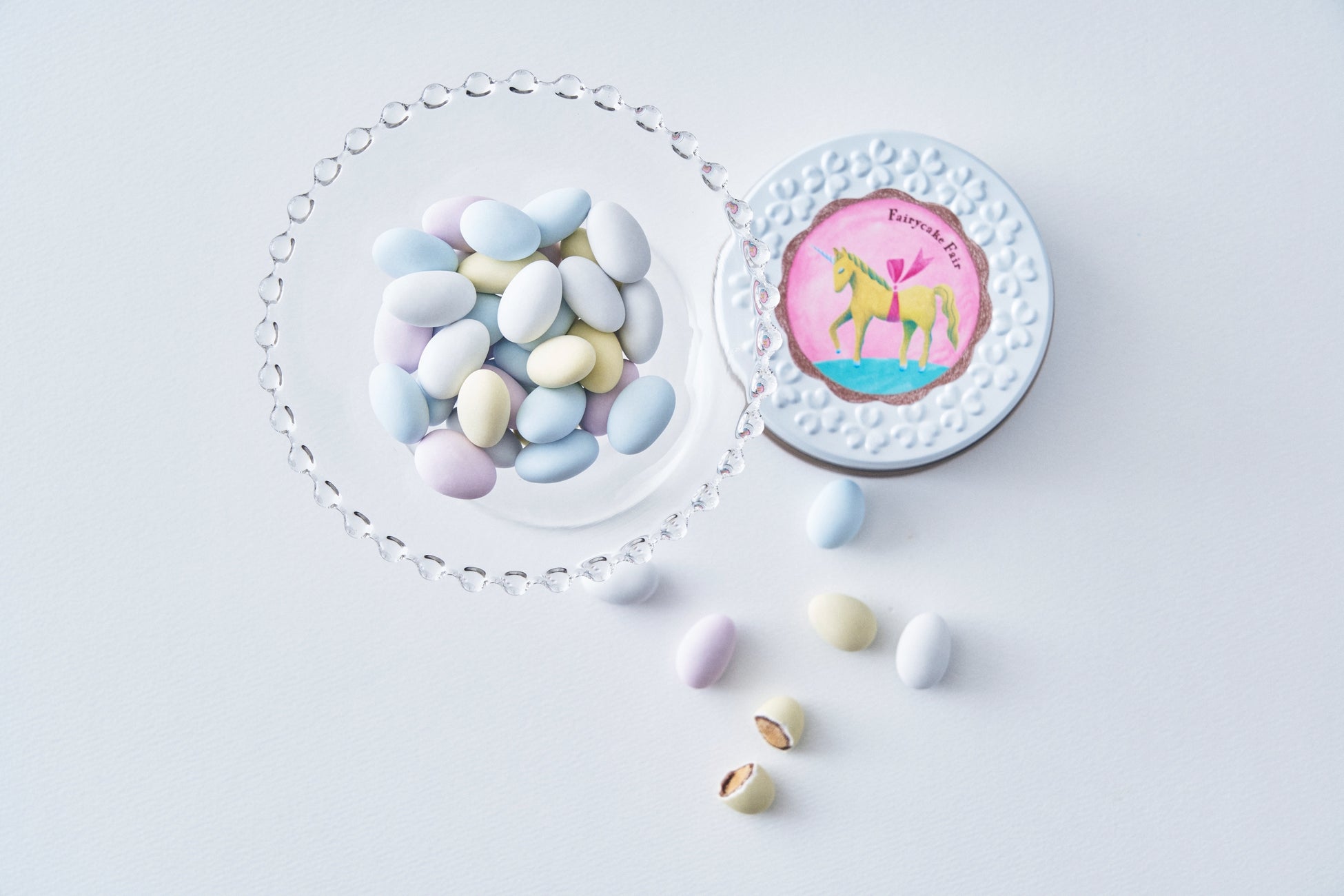 ヨーロッパで“幸福の種”と呼ばれるお祝い菓子、《ドラジェ》。チョコレートアーモンドを、淡い4色の砂糖で包みました。やさしい祝福の気持ちを添える贈りものです。