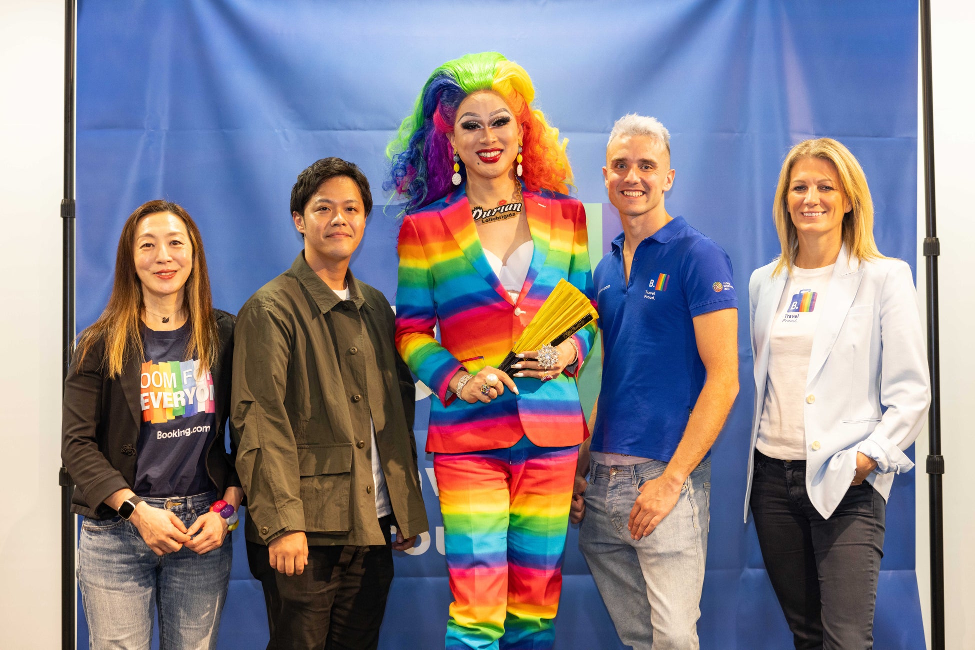 また、ブッキング・ドットコムでは、「Travel Proud」プログラムの日本語版の提供開始に伴い、4月19日(金)に報道関係者向けに本プログラムに関する発表会を開催しました。当日は、ゲストとして、LGBTQ+の当事者で自分自身の軸を持ちながらドラァグクイーンとしても活躍されているドリアン・ロロブリジーダ氏、LGBTQ+当事者で作家、トラベルライター、クリエイターのカラム・マクスウィガン(Calum McSwiggan)氏、また本プログラムをいち早く導入し、認証を取得している宿泊施設「all day place shibuya」の支配人 飯島亮氏が登場し、当社のアジア太平洋地域担当マネージング・ディレクターのローラ・ホールズワースと共に、それぞれの視点からジェンダーやセクシュアリティに関わらず誰もが安心できる旅行の楽しみ方についてパネルトークを実施しました。