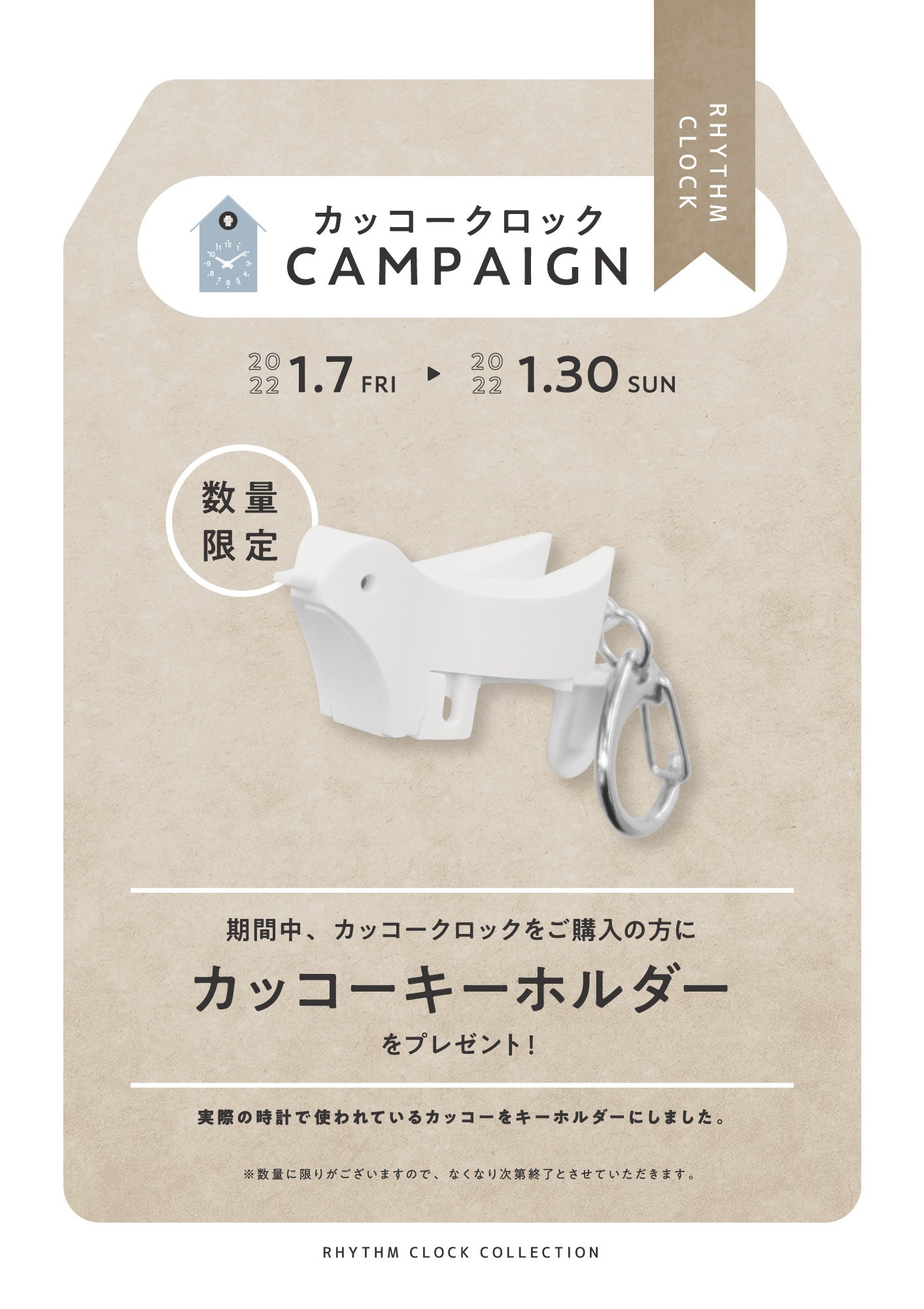 期間中、対象店舗でリズムのカッコークロックをご購入の方にカッコーキーホルダーをプレゼントします。無くなり次第終了します。