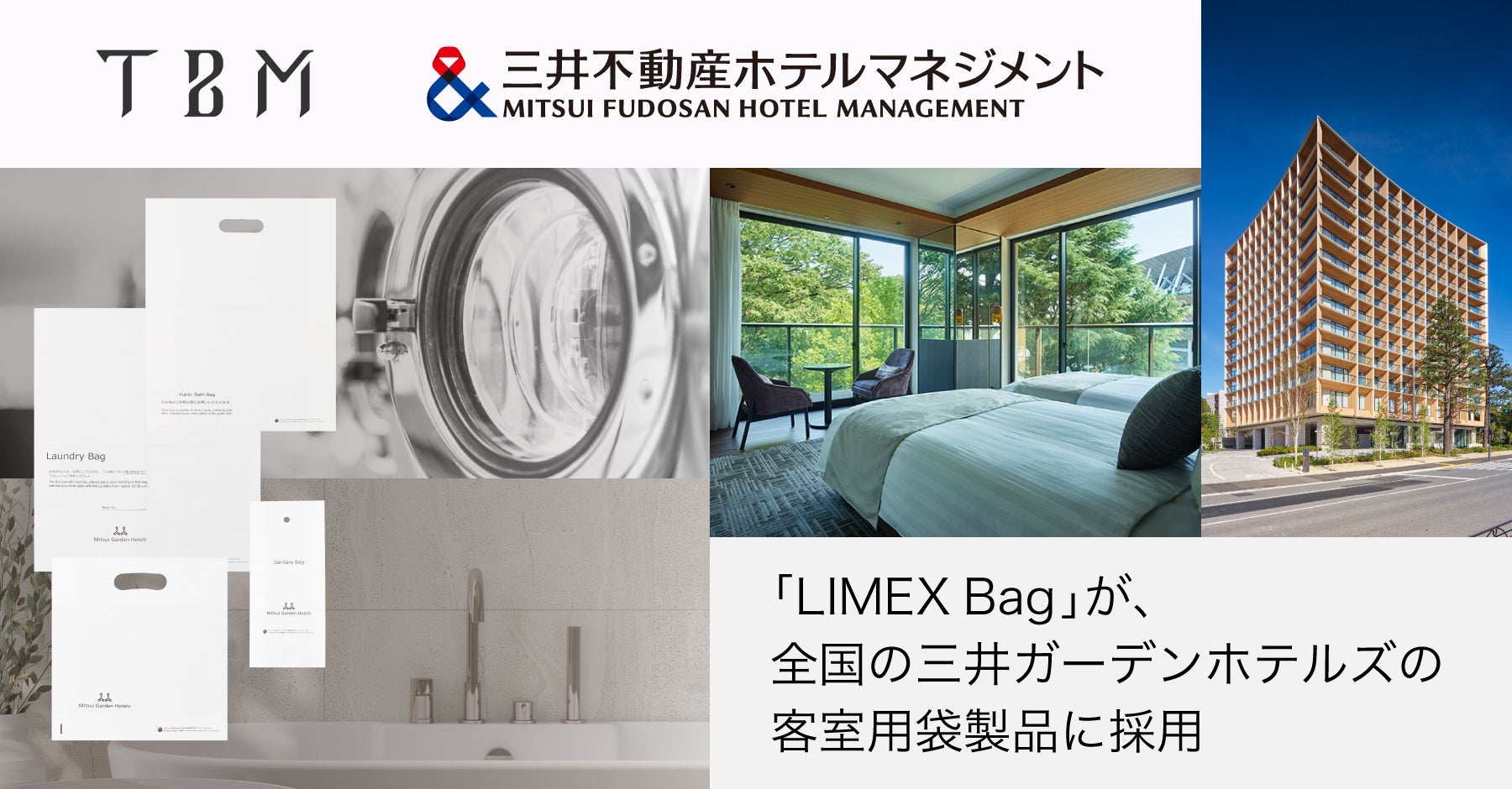 株式会社TBM(本社:東京都千代田区、代表取締役CEO:山﨑敦義、以下TBM)は、株式会社三井不動産ホテルマネジメント(本社:東京都中央区、代表取締役社長 : 雀部優、以下三井不動産ホテルマネジメント)が運営する全国の「三井ガーデンホテルズ」(全34施設、総室数8902*1)で使用される袋製品に、炭酸カルシウム(石灰石)などの無機物を主原料とした「LIMEX Bag(ライメックスバッグ)*2」が採用されたことをお知らせいたします。
