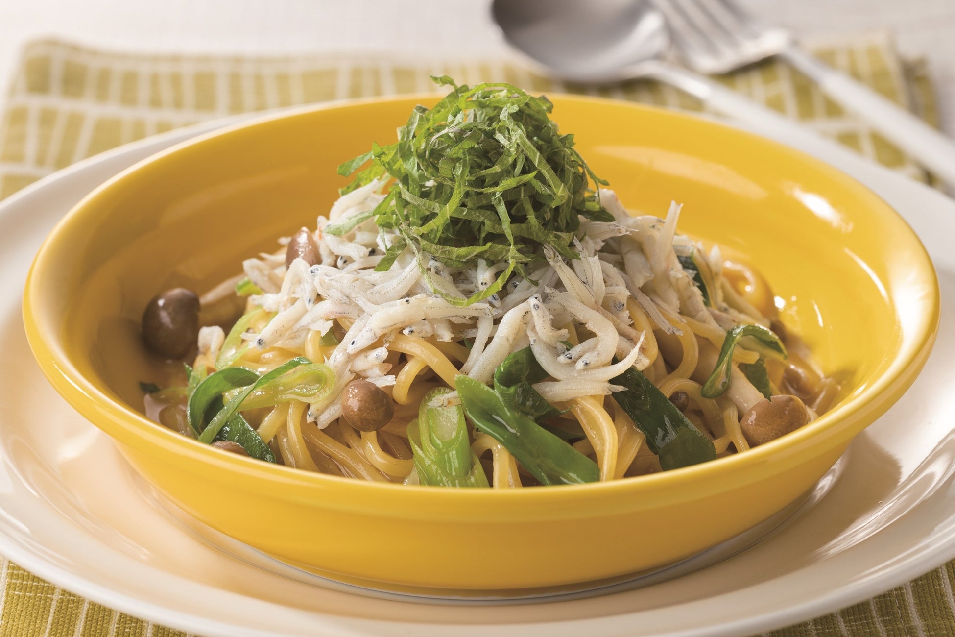 4種の出汁使用のソースとバターを合わせた和風パスタ。大葉・九条ネギの食感、香りがおいしい一皿です。