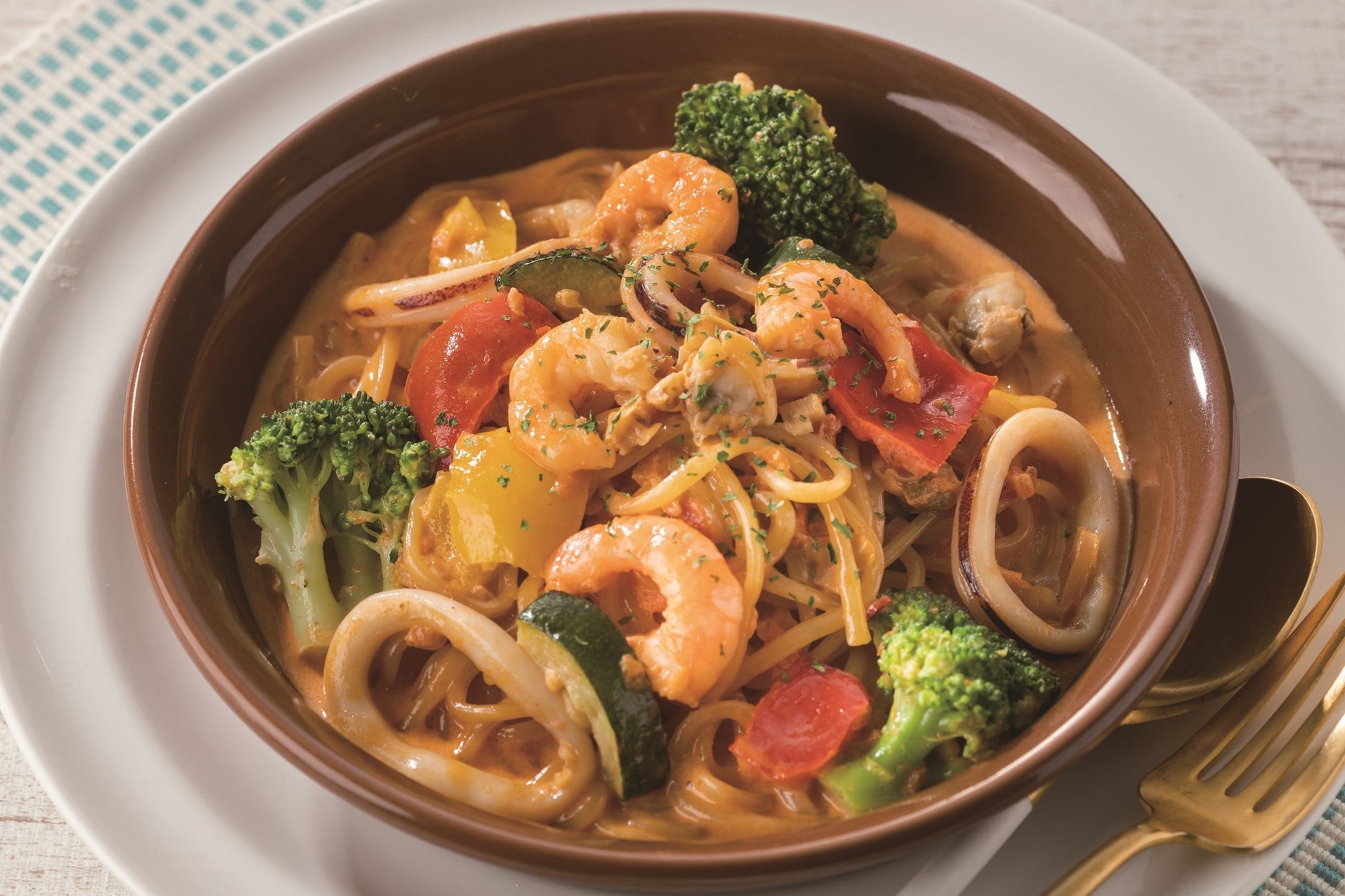 トマトソース&純生クリームの、魚介と野菜の旨みたっぷりのシーフードパスタです。