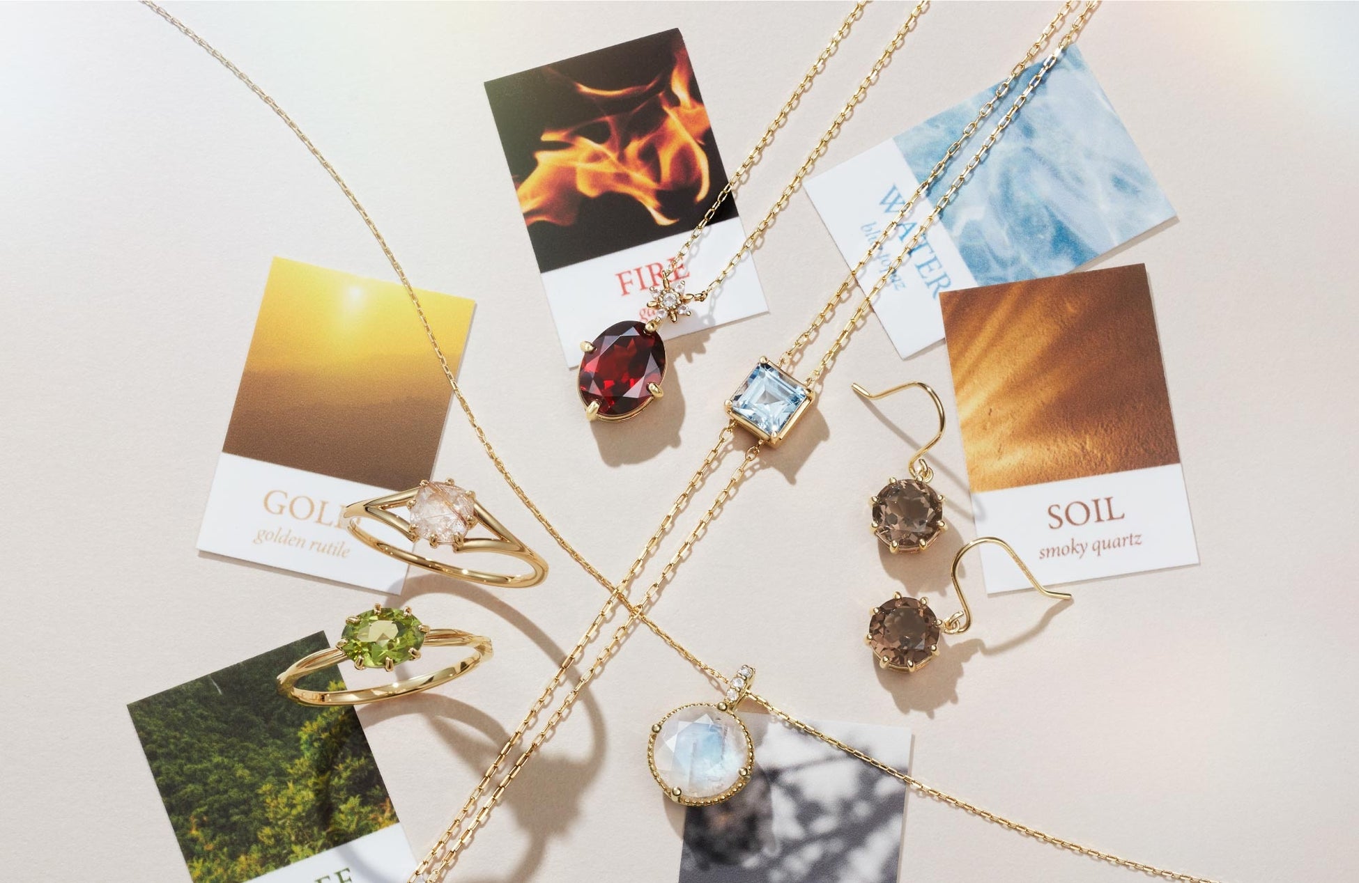「Elements(エレメンツ)」のシリーズでは、「火(ガーネット)」「風(ブルームーンストーン)」「金(ルチルクォーツ)」「水(ブルートパーズ)」「土(スモーキークォーツ)」「木(ペリドット)」の6つの自然エネルギーを表現した天然石をあしらったジュエリーを展開。あなただけのお守りジュエリーとしていつでも寄り添い力を与えてくれます。