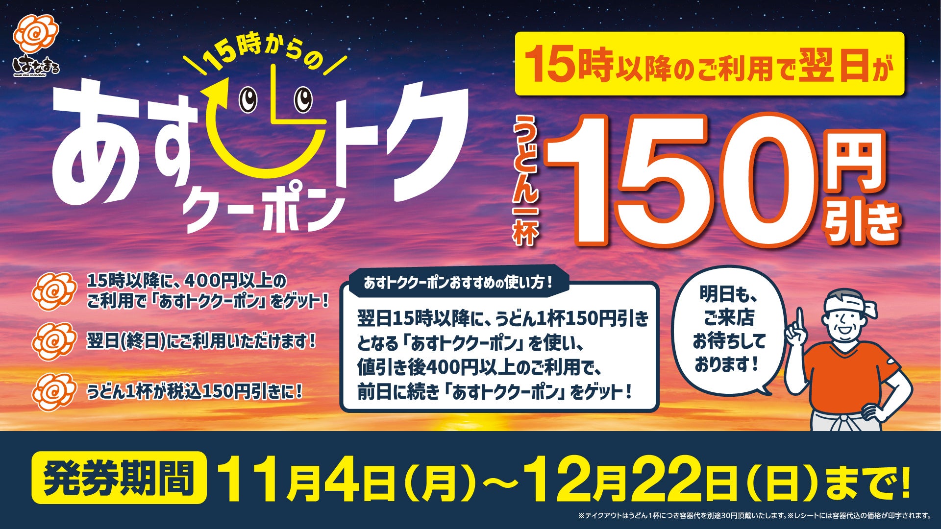 【はなまる】15時以降のご利用で翌日がお得に!はなまる あすトククーポン(うどん150円引き) 11月4日(月)15時より開始