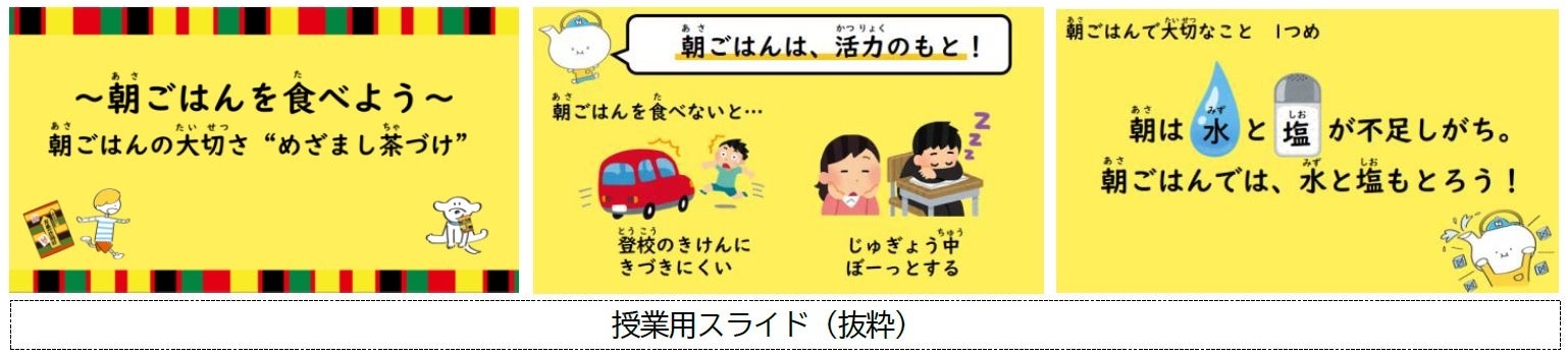・授業内容:「朝ごはんの大切さ」をメインに進めていきます。朝ごはんを食べることによって「あたま・からだ・おなか」の3つのスイッチが入ることや、水分・塩分摂取の重要性などについて伝えます。また、「お茶づけとはどのようなものか」「めざまし茶づけ」についてなど、パワーポイント資料をもとに各小学校の先生のやり方に沿って授業を実施していただきます(1 コマ45分)。授業の中でクイズやワークを行い、一方的ではなく、互いに楽しみながら学べる工夫をしています。
