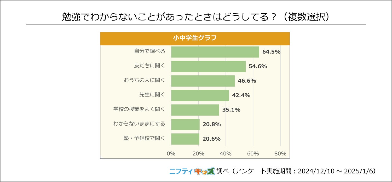 勉強でわからないことがあったときにどうするかを聞いたところ、最も多い回答は「自分で調べる」でした。小中学生どちらも2位は「友だちに聞く」であることから、まずは子どもたちだけで解決を試みていることがわかりました。
