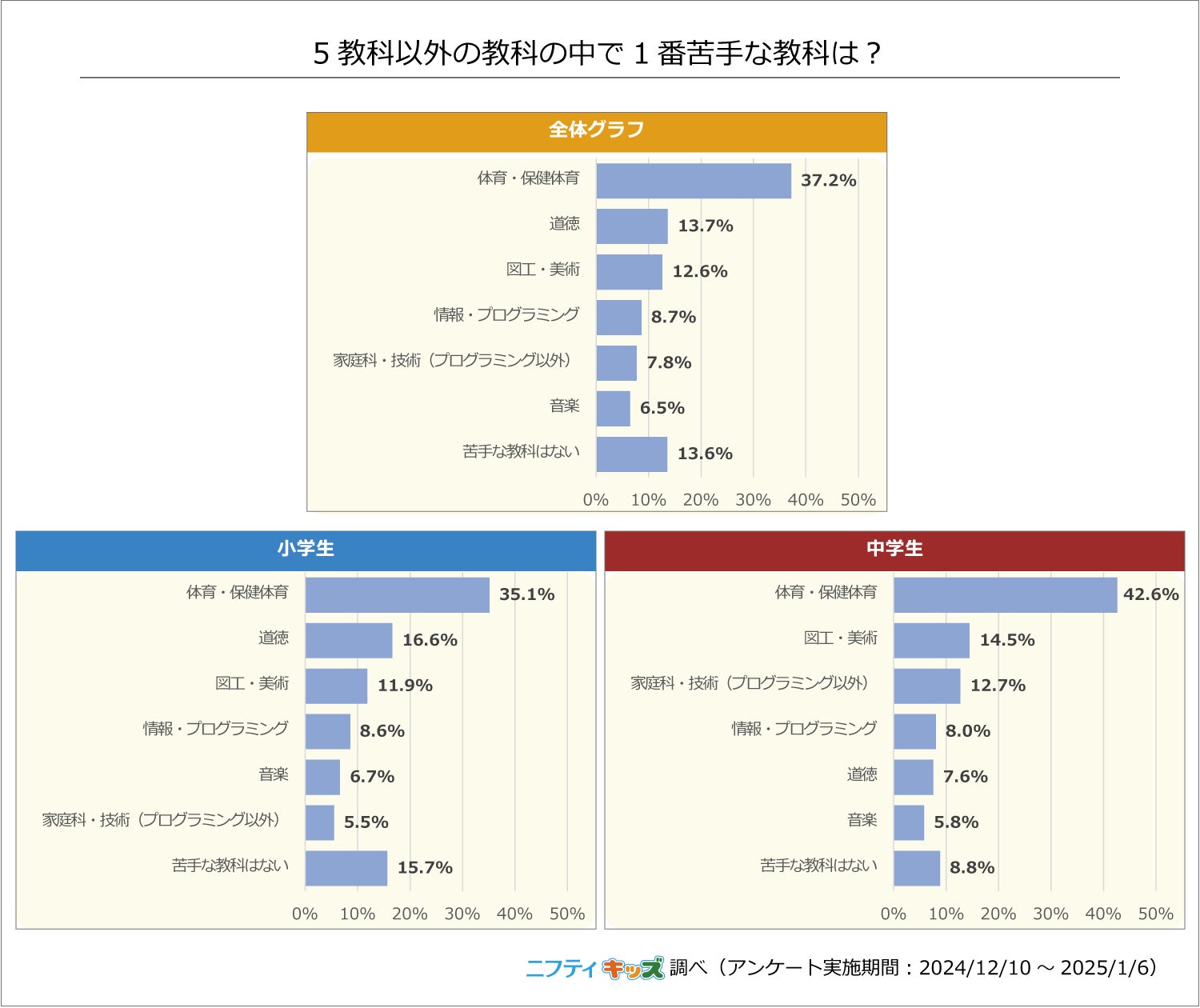 小学生・中学生ともに最も多かった回答は「体育・保健体育」でした。小学生で35.1%、中学生で42.6%の人が「苦手」と答えているため、中学生の方がより「体育・保健体育」に苦手意識を持っているようです。