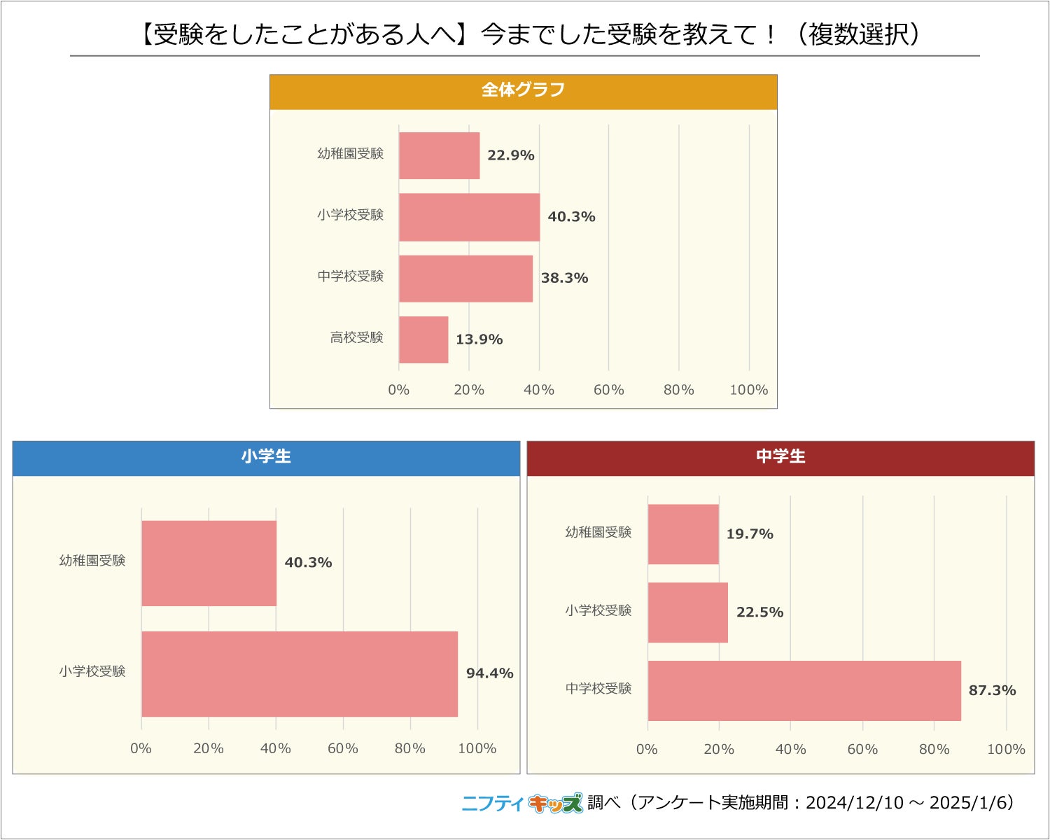 小学生で受験をしたことがあるほとんどの人が「小学校受験」をしているようですが、約4割は「幼稚園受験」も経験していることがわかりました。また、中学生で受験をしたことがある約9割の子どもたちは「中学校受験」を経験していて、「小学校受験」、「幼稚園受験」を経験した人は2割程度でした。