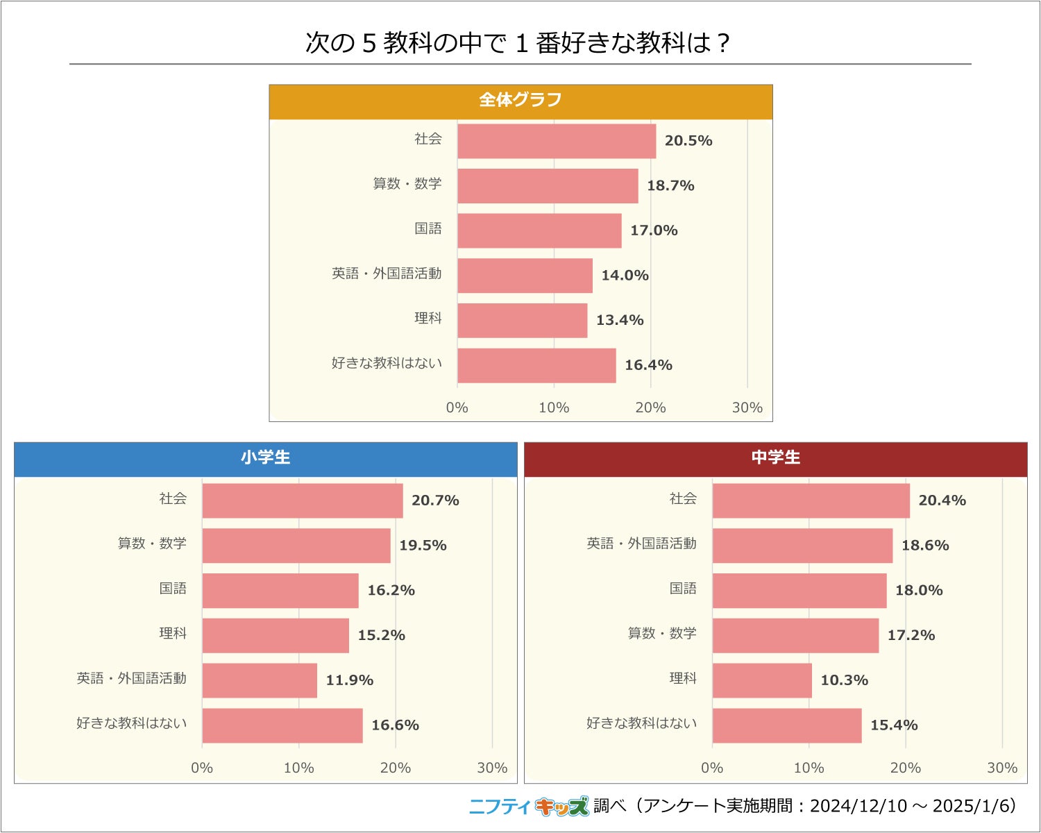2024年の調査では、「社会」は上位ではあったものの、小学生では「国語」「算数・数学」が1位でした。(注1)中学生では今回同様「社会」が1位でした。