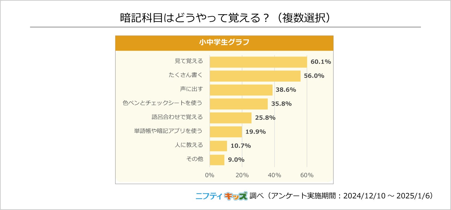 暗記科目は「見て覚える」が60.1%で最多でした。2位は56%の「たくさん書く」で1位と大きな差はなく、3位以下には「声に出す」「色ペンとチェックシートを使う」などの回答が並びました。