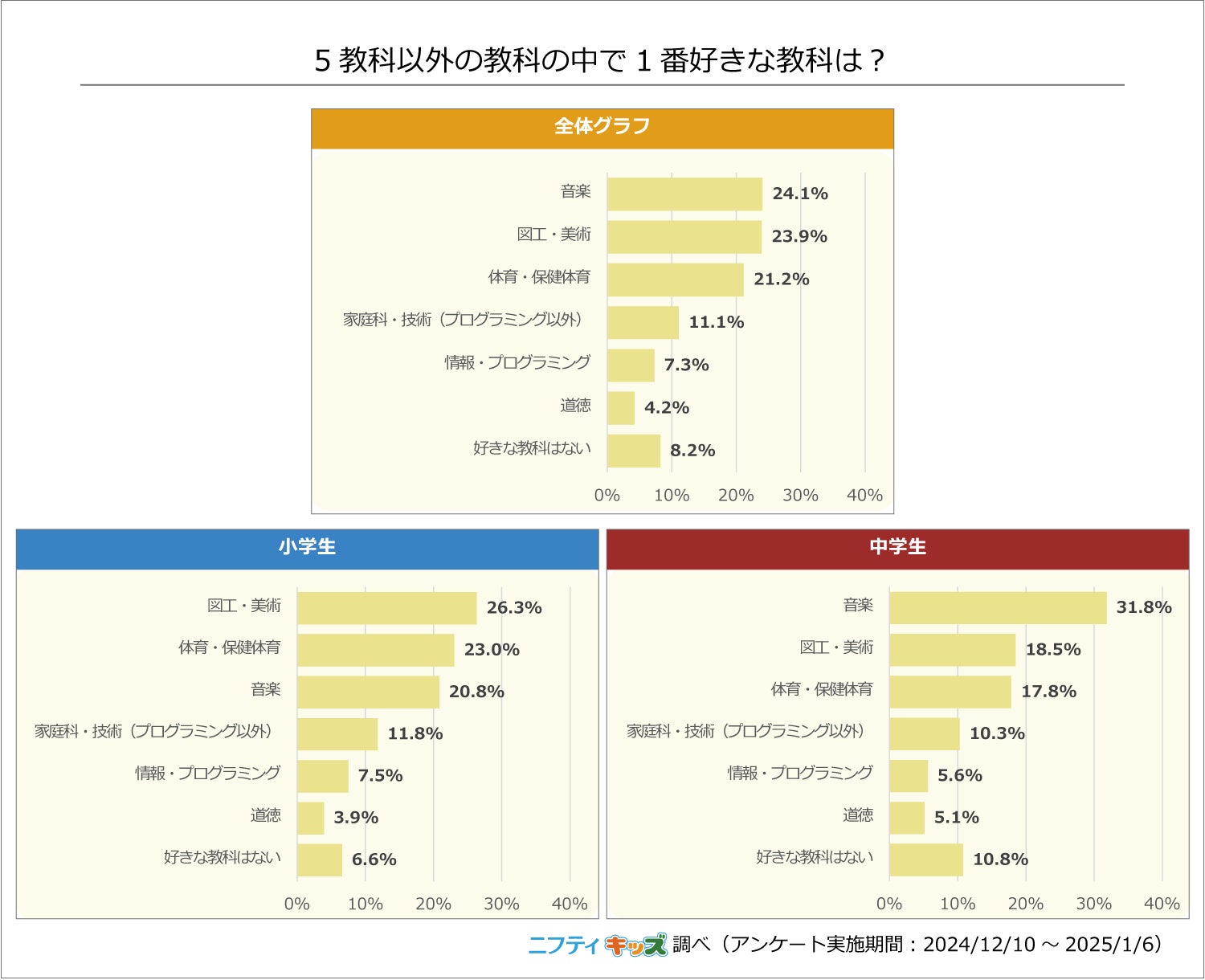 小学生では「図工・美術」、中学生では「音楽」が1位でした。