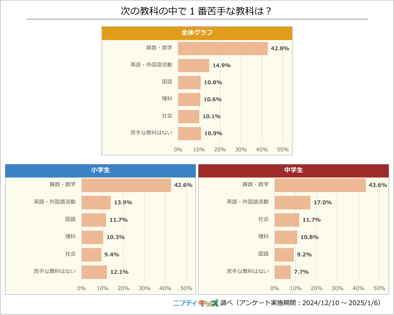 【調査結果】小中学生ともに5教科で好きな教科は「社会」、苦手な教科は「算数・数学」