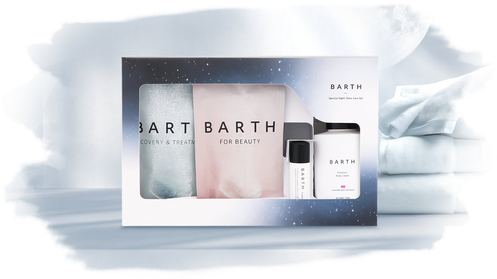 世界でも希少な中性重炭酸泉から着想を得た「薬用BARTH中性重炭酸入浴剤」をはじめとして、ナイトタイムを充実させるプロダクトを展開。“入浴”や“睡眠”といった何気ない日々の暮らしにワンエッセンス加えるだけで満たされる、プレミアムなナイトケア体験を提供します。