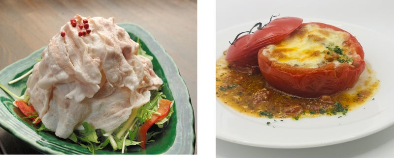 ▲(左から)秋田県桃豚冷しゃぶサラダ、熊本県産のトマト