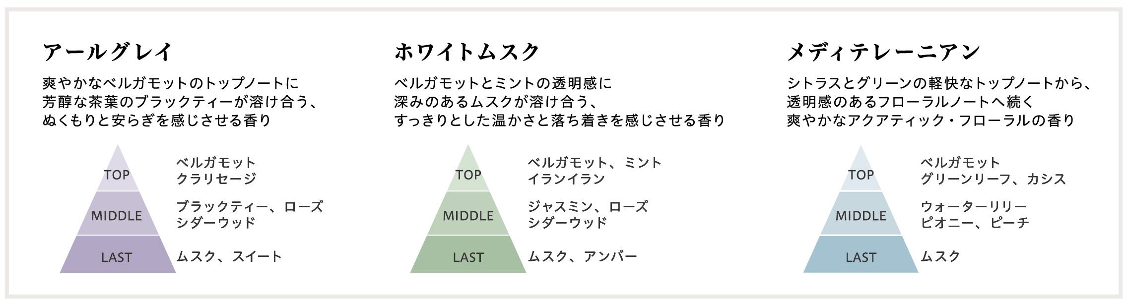 定番人気の香り「ホワイトムスク」「メディテレーニアン」と、昨年新しく加わり好評いただいているティーフレグランス「アールグレイ」の3種展開。