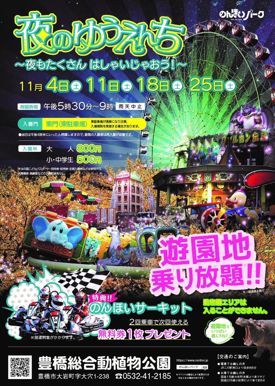 11月の毎土曜日17時30分~21時00分に、遊園地エリアの遊具が乗り放題となる「夜のゆうえんち」を開催します。ぜひ豊橋総合動植物公園「のんほいパーク」へお越しください。