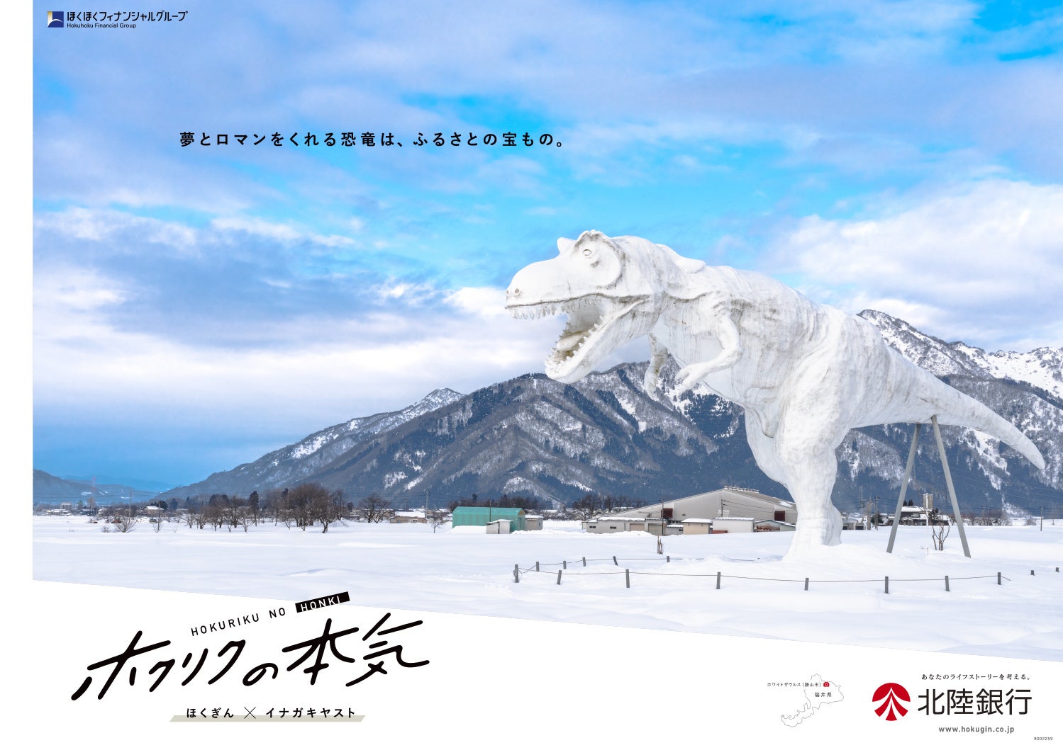今回は富山県と福井県の風景を切り取った2作品を、北陸銀行ポスター等広告媒体で発信いたします。雪の白と空の青のコントラストが鮮烈な作品と、恐竜も凍えるような冬の空気を感じる作品です。
