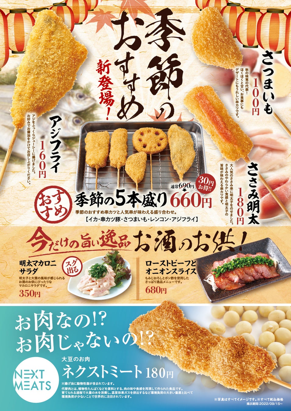 (期間限定メニュー「さつまいも」「ささみ明太」「季節の5本盛り」は12月7日(水)ま での販売です。)【注意事項】