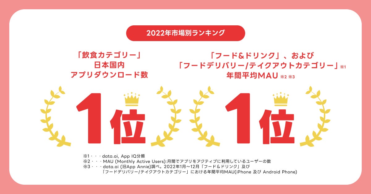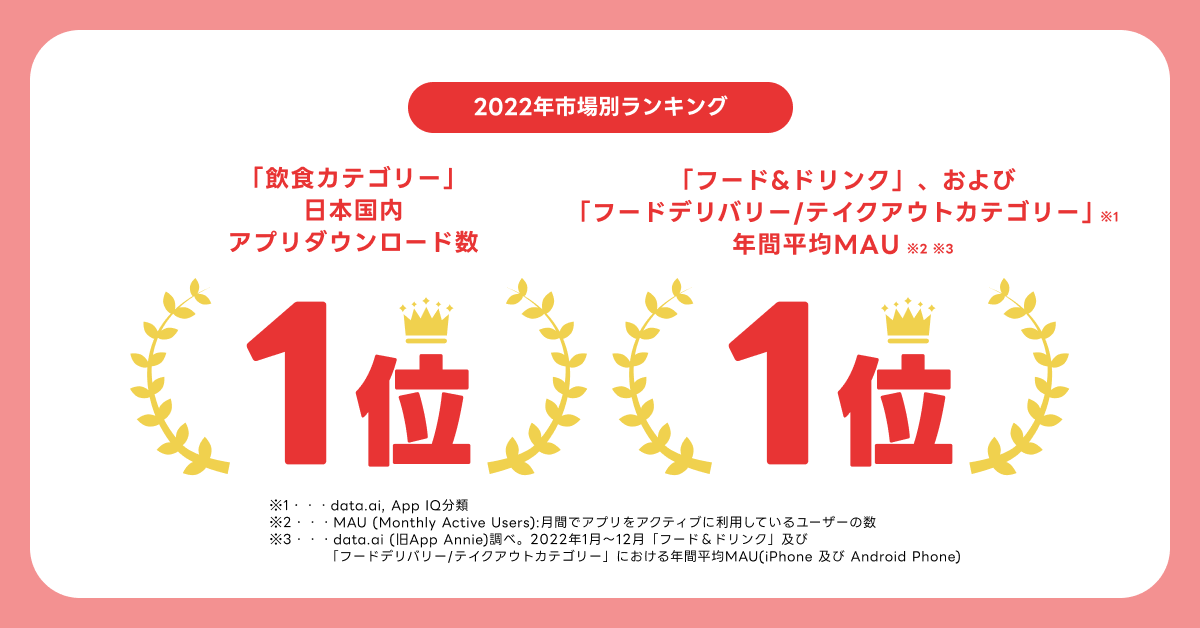 ※4・・・data.ai (旧App Annie)調べ。2022年1月〜12月「フード&ドリンク」及び「フードデリバリー/テイクアウト」カテゴリーにおける年間平均MAU (iPhone 及び Android Phone)