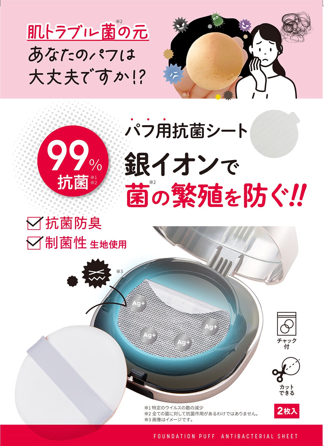 そんなパフを簡単に抗菌する「抗菌ファンデパフクリアキープシート」。Ag+銀イオンで菌の繁殖を防ぎます。ファンデーションのケースに合わせてカットができて、はがす時もつまみ付きだからはがしやすい!取り換えに便利な2枚入りです。