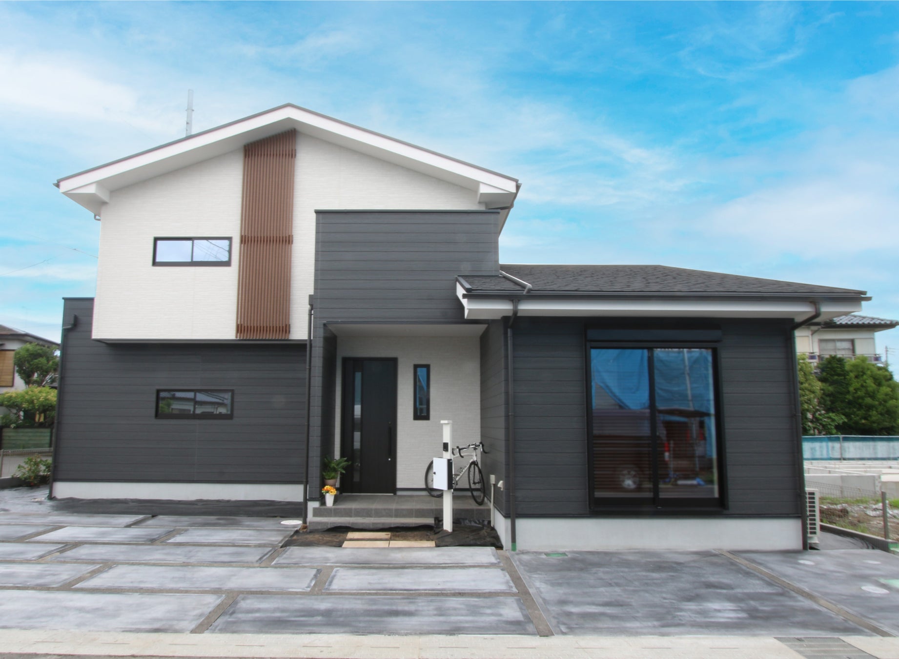 その土地特有の文化や風土の流れを汲んだ「現代の蔵づくり」をテーマに、チャコールカラーの落ち着いた風合いの木目調と、定石である漆喰風をあえて外し、天然石の風合いが美しいリエットとの対比により存在感が際立つ外観。白と黒のコントラストに木目のアルミ格子が加わることで、重厚でありながら情緒豊かな和モダンの世界観を見事に表現している。