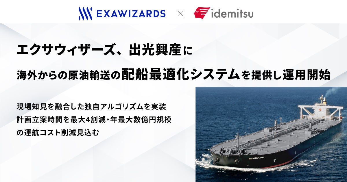 株式会社エクサウィザーズ(東京都港区、代表取締役社長CEO:春田 真、以下エクサウィザーズ)は、出光興産株式会社(東京都千代田区、代表取締役社長:酒井 則明、以下出光興産)に対し、海外の原油を輸送する配船計画を高度化するオペレーションモデル、および最適化システムを開発・提供したことをお知らせします。2025年4月より外航船配船(※1)のタンカーを対象に段階的に運用を開始しました。外航船配船に特有の複雑な条件を考慮した独自アルゴリズムを開発し、安定供給と運航コストの最小化を高い次元で両立させることが可能となりました。
