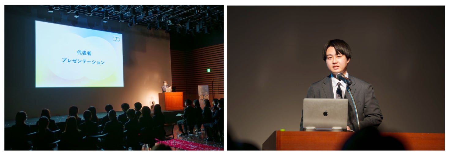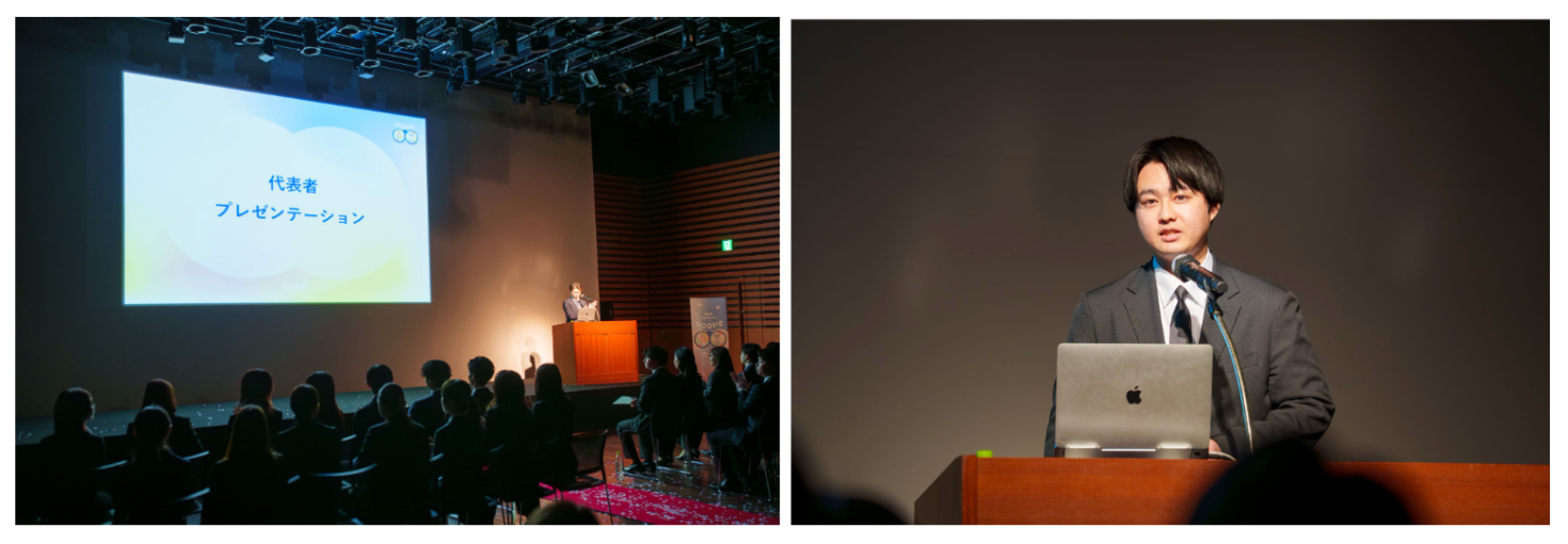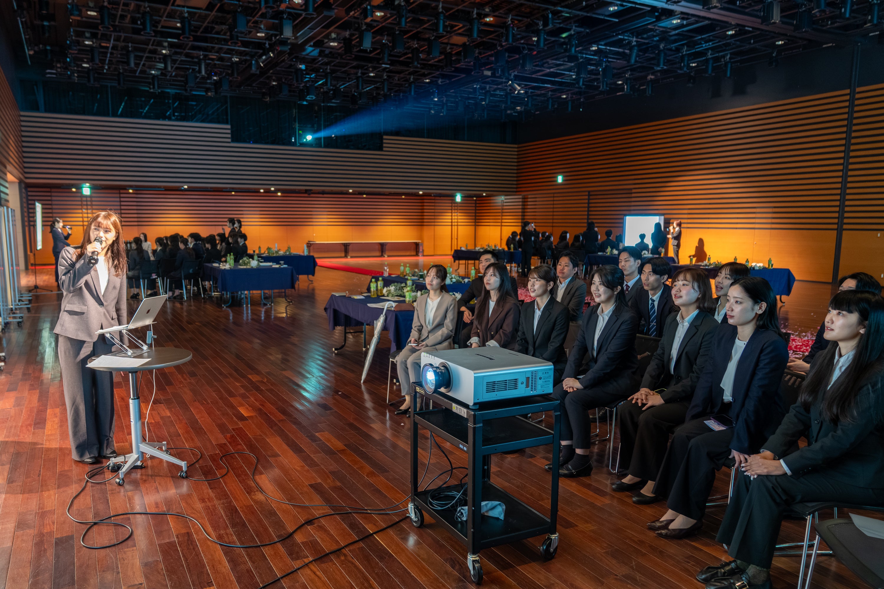 入社式のメインプログラムは、新入社員一人ひとりによる決意表明です。SCOPEというテーマに準え、「アイグッズという組織をなぜ選んだのか、これからどのような“未来”を描きたいか」を4つのブースに分かれてプレゼンしました。内定期間の約半年を捧げ、描きたい未来を考え続けたからこそ、式中に想いが溢れて涙する新入社員もいました。