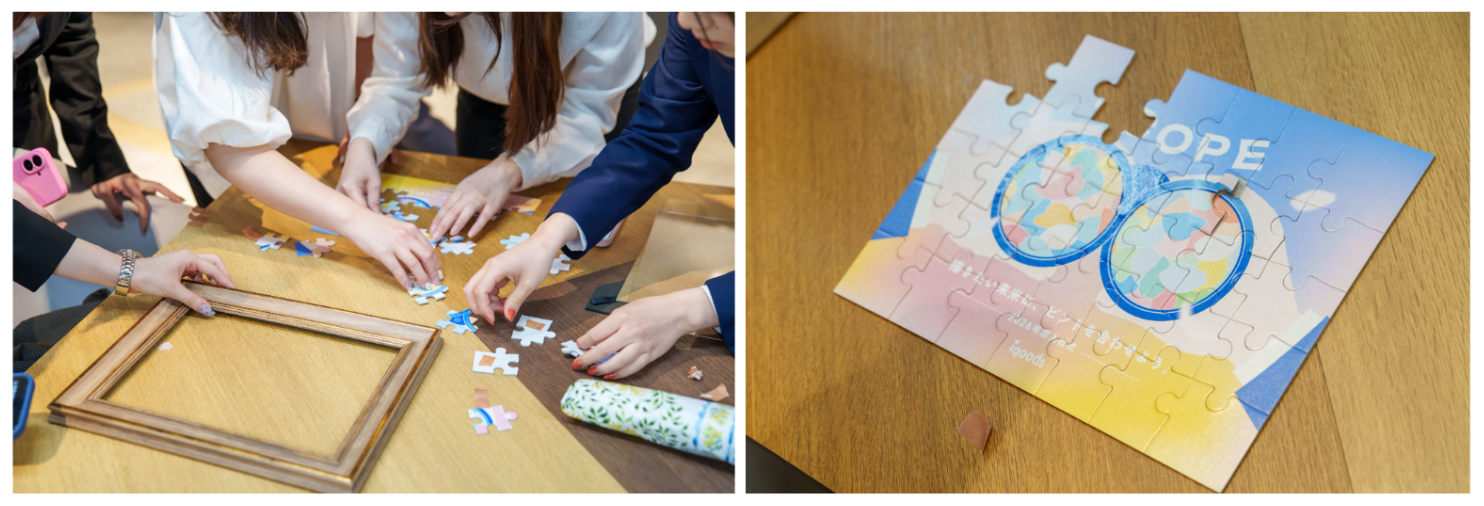 会場到着前には、プチサプライズも実施しました。当日、何も知らされていない新入社員は、本社に集合。社内に散らばった28個のパズルピースを集め、1つの絵を完成させるというミッションが課されました。完成したパズルには「SCOPE」という文字が浮かび上がり、新入社員28名へ向けて入社式テーマがサプライズ発表されました。