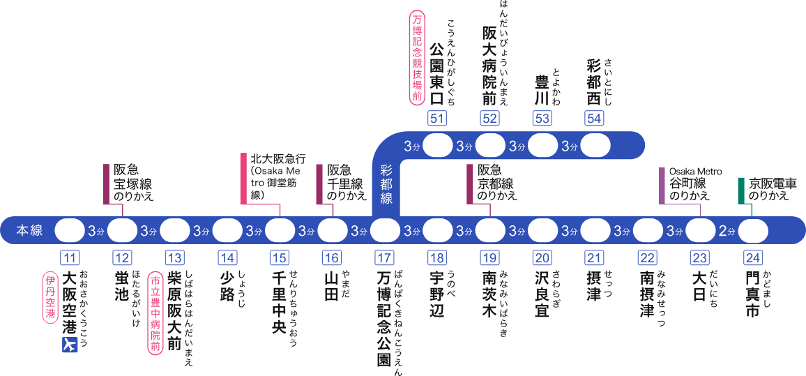 大阪モノレールは、日本のモノレールで1番長い総延長28キロ・18駅を結ぶ路線で、大阪府の放射状に伸びる鉄道網と接続する移動手段として、1日13万人のお客さまにご利用いただいています。また、大阪空港駅は大阪国際(伊丹)空港に直結しており、空港をご利用される方の空の玄関口となっています。