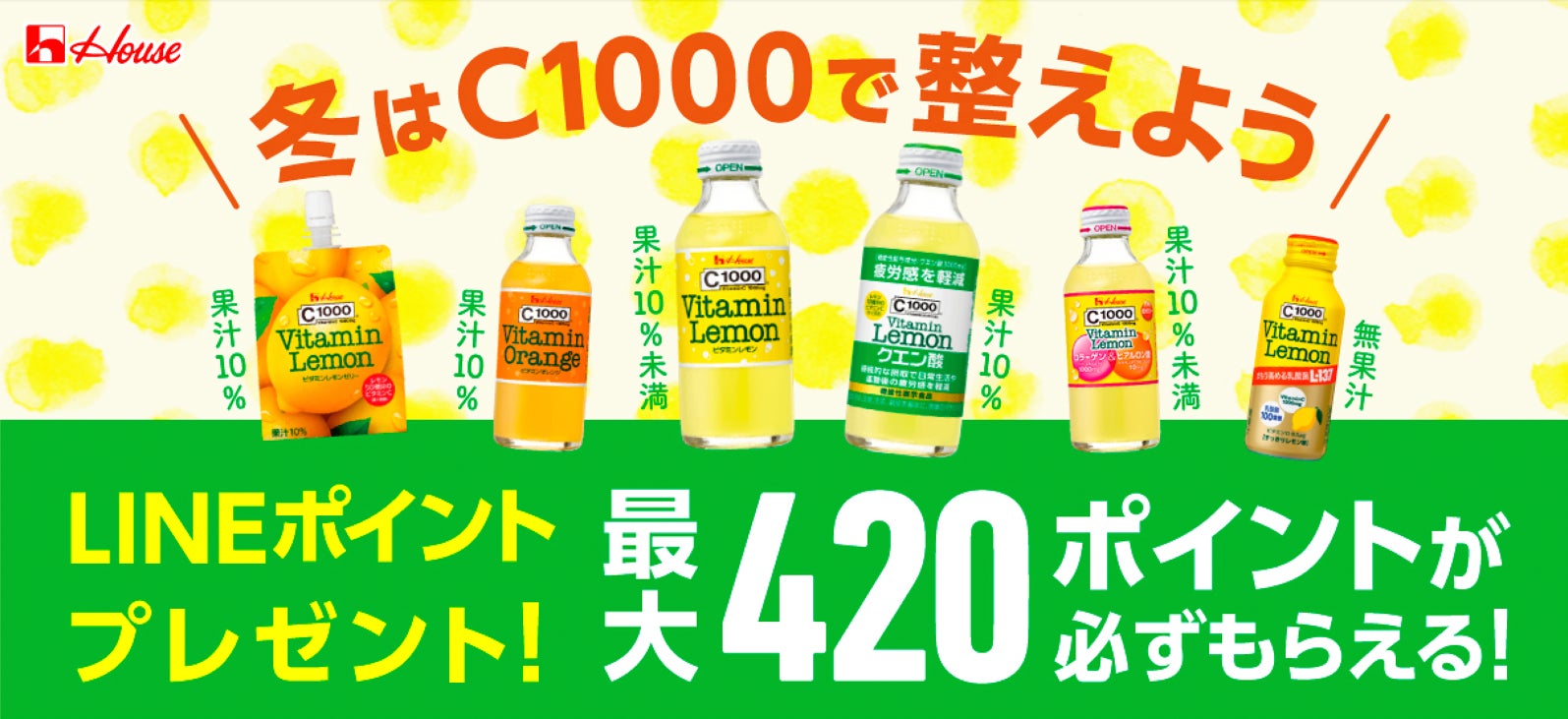 ハウスウェルネスフーズは、『冬はC1000で整えようキャンペーン』を11月21日から1月31日の期間で開催します。「C1000 ビタミンレモン」を始めとする対象製品の購入レシートで応募ができ、「LINEポイント」が必ずもらえるキャンペーンです。「LINEポイント」は最大で420ポイントもらえます。