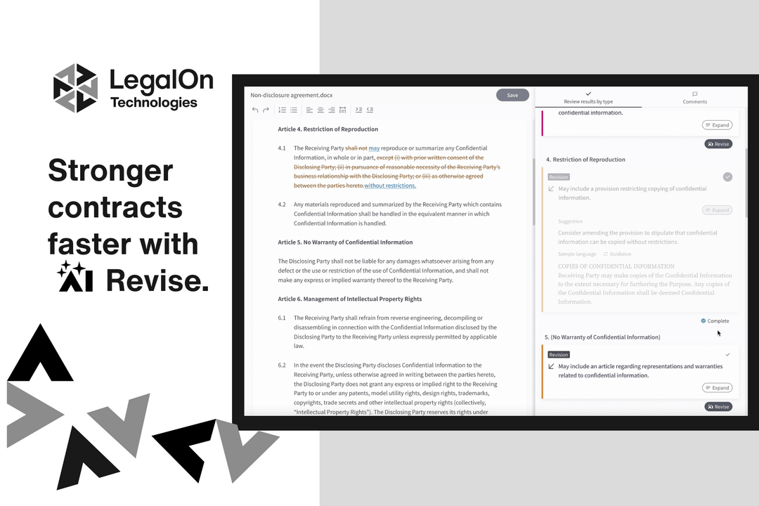 LegalOn Technologies(US)は、OpenAIの最新GPT技術を活用した契約書の修正文案表示機能「AI Revise」を搭載するAI契約レビュー支援ソフトウェア「LegalOn Review」を提供開始しました。弊社の弁護士による法的ガイダンスと最新のテクノロジーを組み合わせることで、数秒で高度な契約書の修正を実施することが可能になりました。このほか、「LegalOn Review」には効率化と品質向上を両立する契約書の自動レビュー機能、エディタ機能、契約書や条文の検索機能、比較機能などを搭載しています。