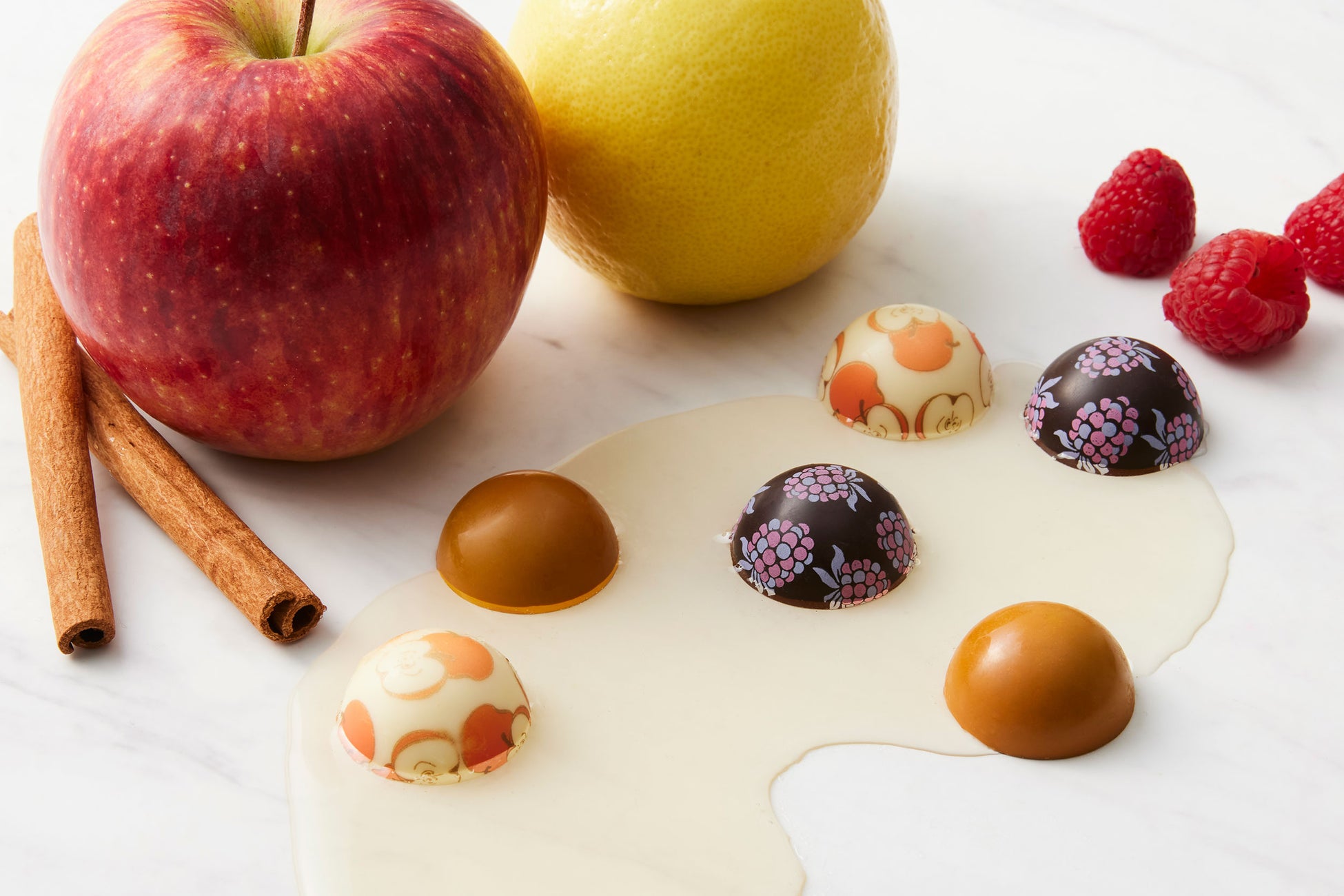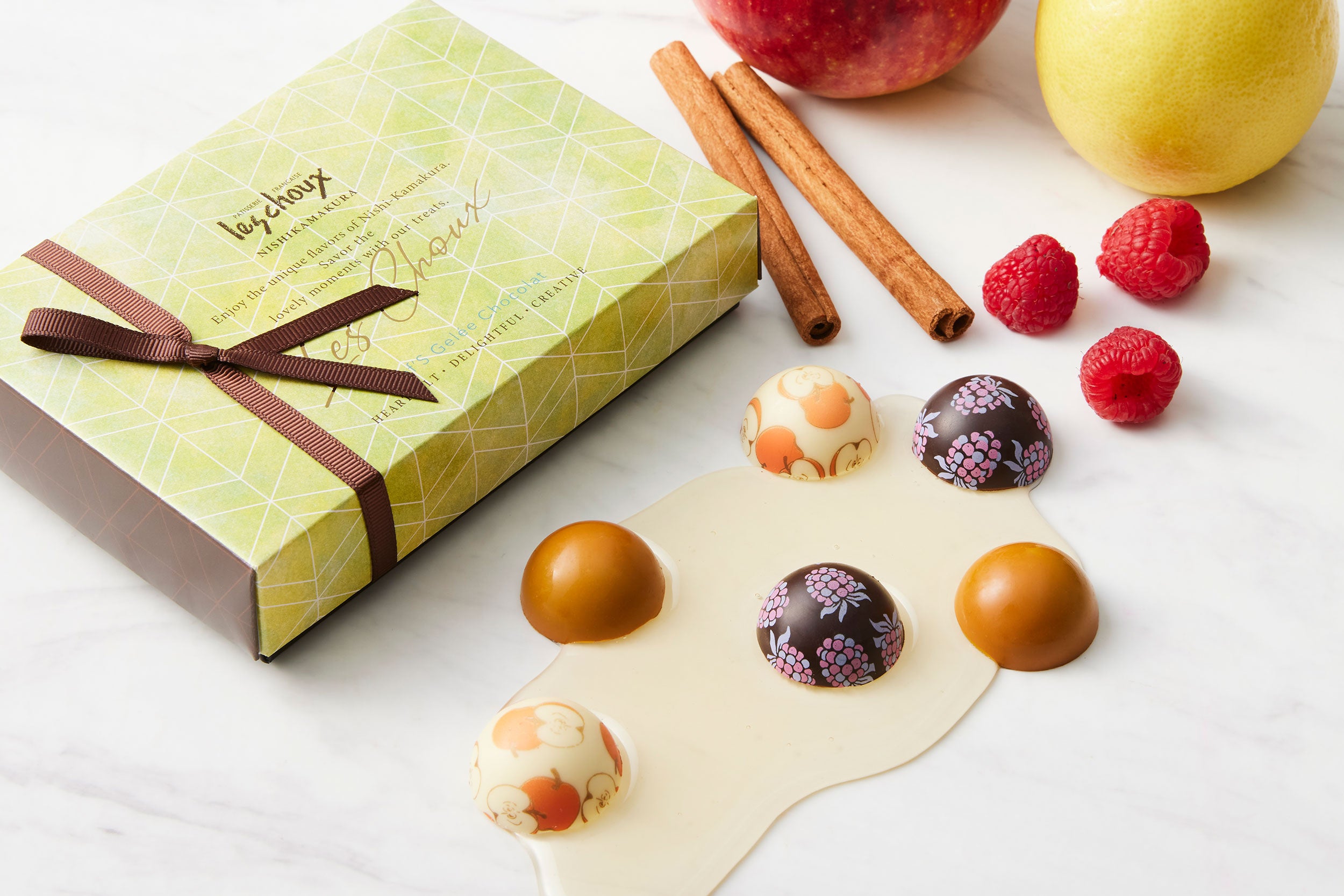 ビター、ミルク、ホワイトショコラに、それぞれ湘南ゴールドやフランボワーズ、シナモンアップルのフルーティーな味わいのジュレを合わせました。