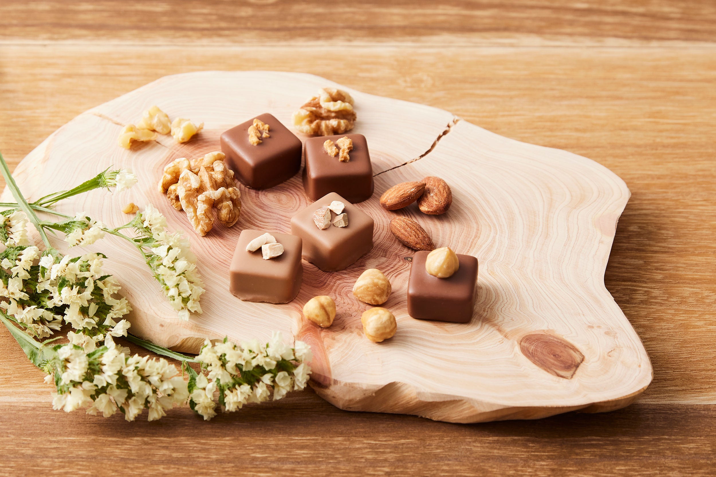 くるみ・アーモンド・ヘーゼルナッツガナッシュに、クラッシュナッツやホールナッツをトッピングし華やかに仕上げました。