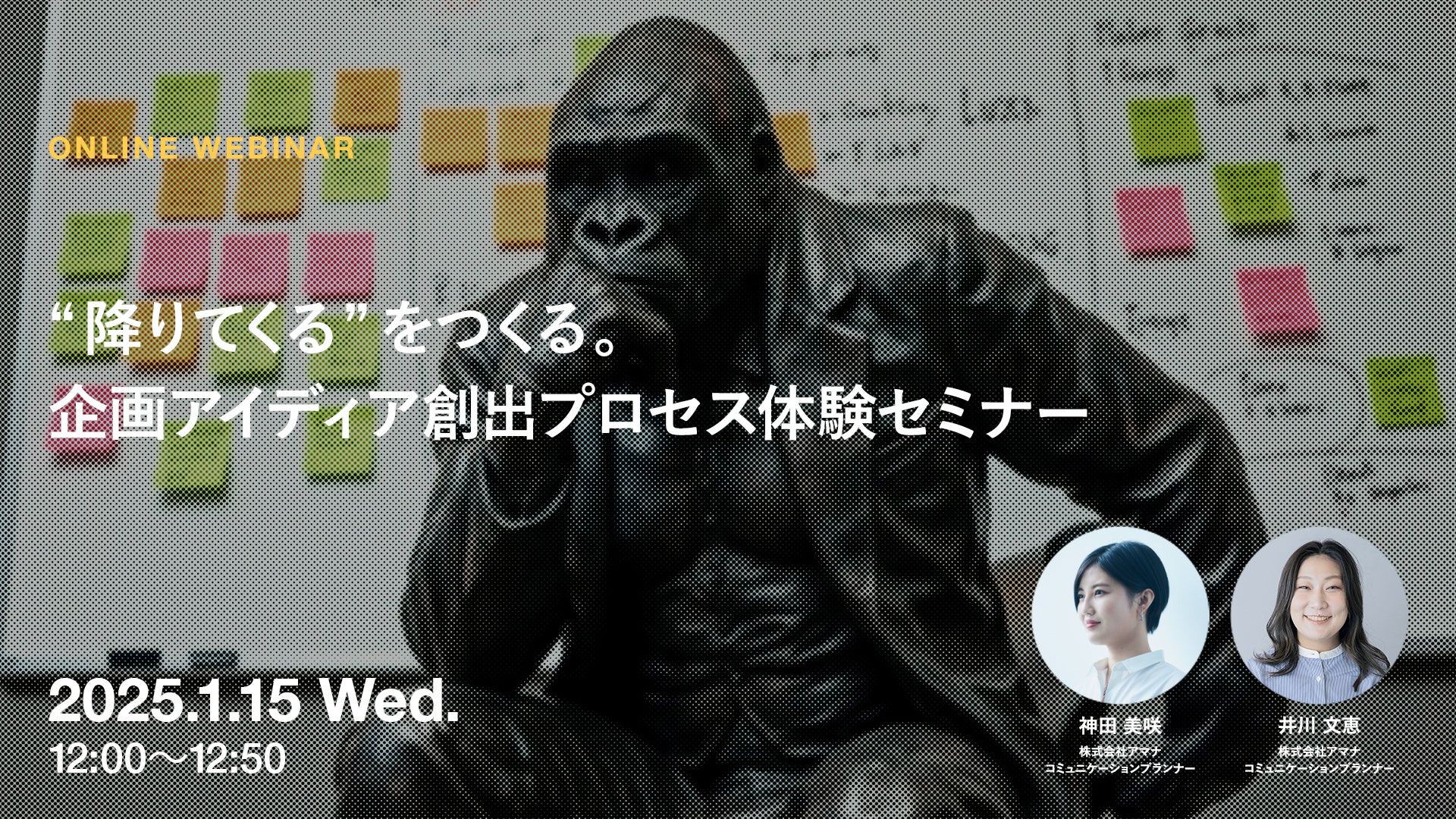 コミュニケーション変革をクリエイティブで実現する株式会社アマナ(本社:東京都品川区、代表取締役社長:金子剛章、以下「アマナ」)は、2025年1月15日(水)、「“降りてくる”をつくる。企画アイディア創出プロセス体験セミナー」をテーマにウェビナーを開催します。